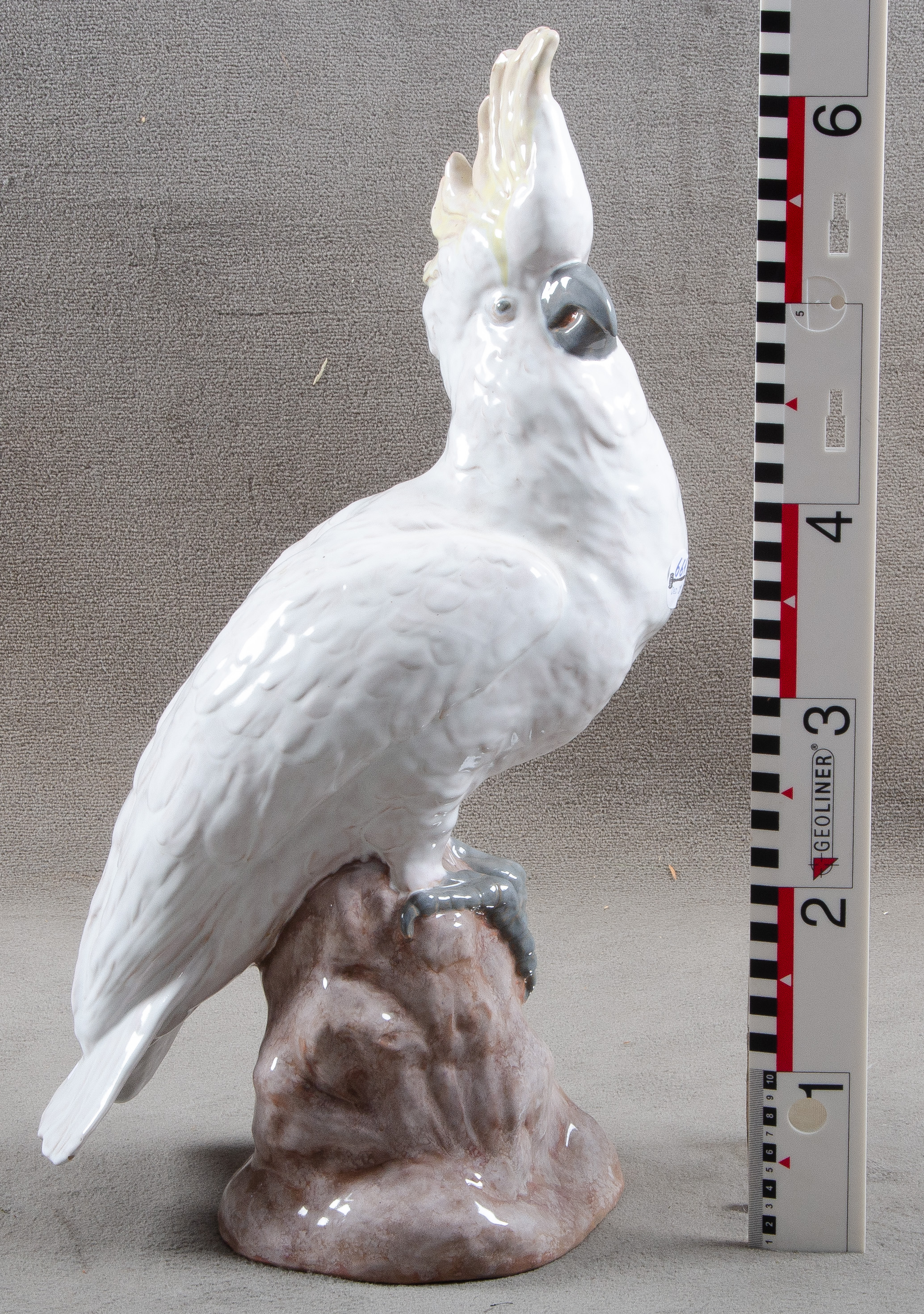 - Katalog-Nr: 661Kakadu. Karlsruher Majolika 20. Jh. Irdengut, naturalistisch modelliert und staffiert; am Boden gemarkt, Entwurf von Emil Pottner, H=62 cm.o.L.