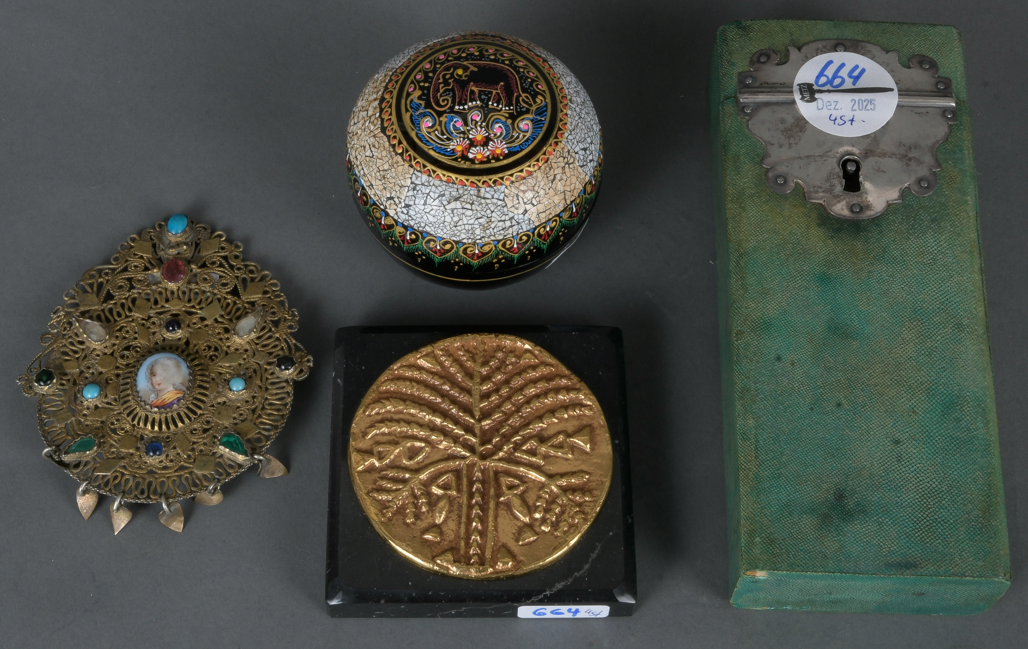 - Katalog-Nr: 664Vier unterschiedliche Kleinkunstobjekte. Deutschland / Griechenland 19./20. Jh. Bestehend aus: Ein Holzetui mit Fischhautummantelung (H=17,5 cm, B=7,5 cm, T=4,4 cm), eine runde Holzdose (H=7 cm, D=7,8 cm), eine runde Bronzemedaille (D=7,6 cm) und eine Gürtelschließe mit Miniatur (10,3 x 8,6 cm).o.L.
