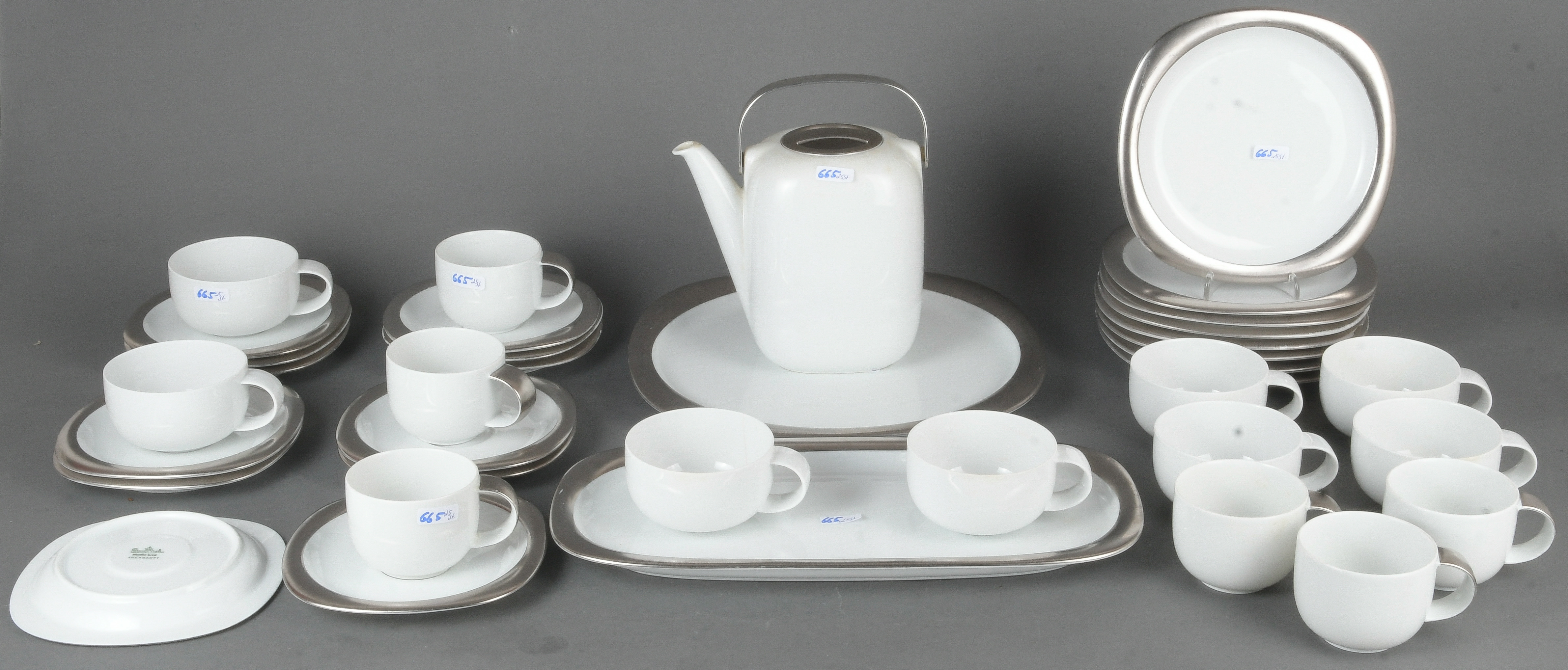 - Katalog-Nr: 66525-tlgs. Service „Suomi Anthrazit“. Rosenthal 1976. Bestehend aus: Eine Kanne mit beweglichem Metallbügel (H=21 cm), acht Kaffeetassen und sechs Teetassen mit zwölf Untertassen, acht Kuchenteller (D=je 21 cm), eine Kuchenplatte (29,5 x 29,5 cm) und eine Anbietplatte (36 x 17,5 cm). Porzellan mit platinfarbenem Rand, Entwurf von Timo Sarpaneva. (berieben / best.)o.L.