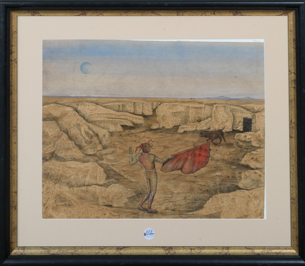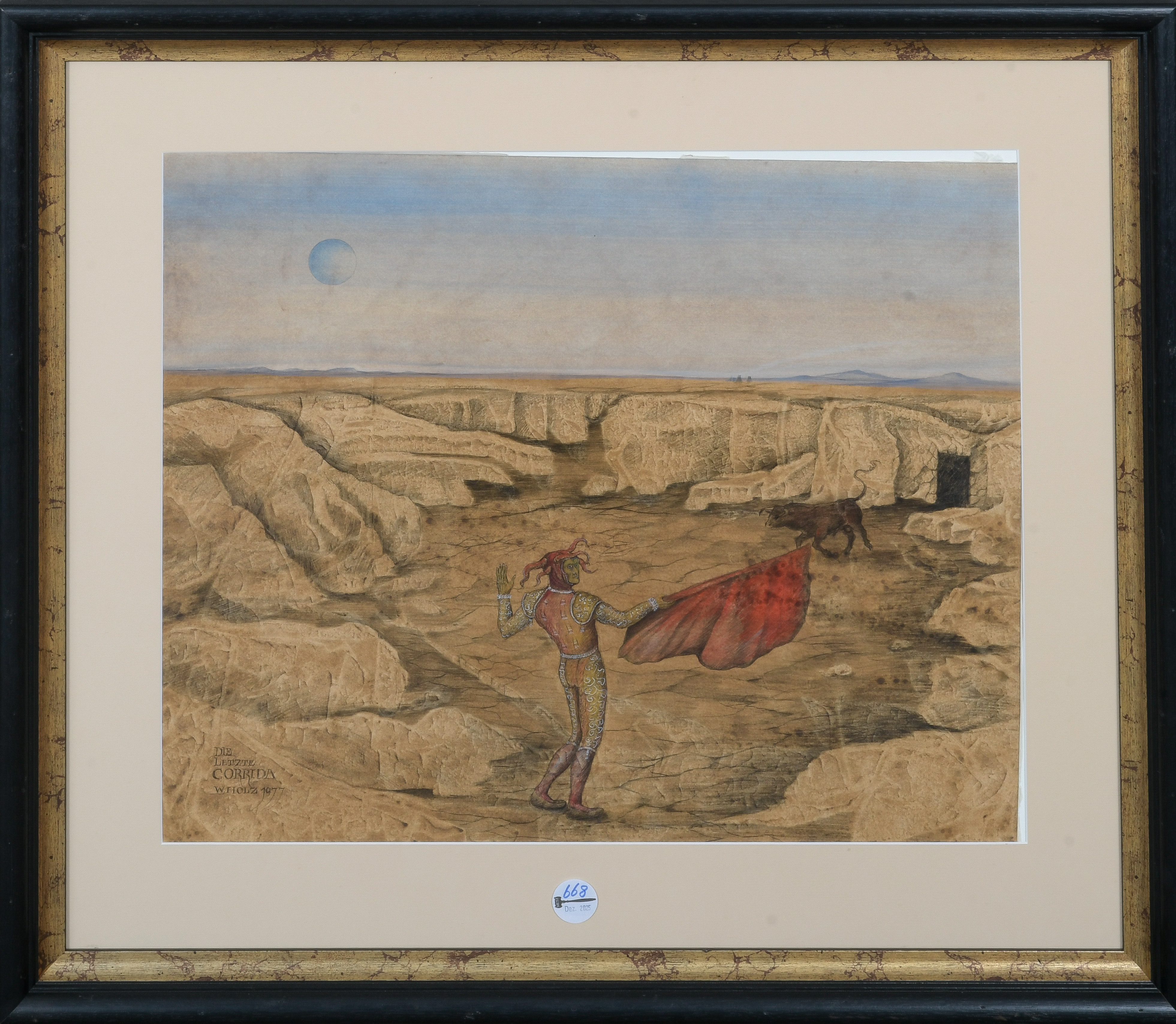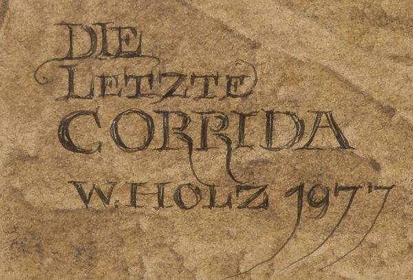 - Katalog-Nr: 668Werner Holz (1948-1991). „Die letzte Corrida“. Aquarell/Papier, li./u./bez./sign./dat. 1977, mit Passepartout hi./Gl. gerahmt, 49 x 59 cm.o.L.
