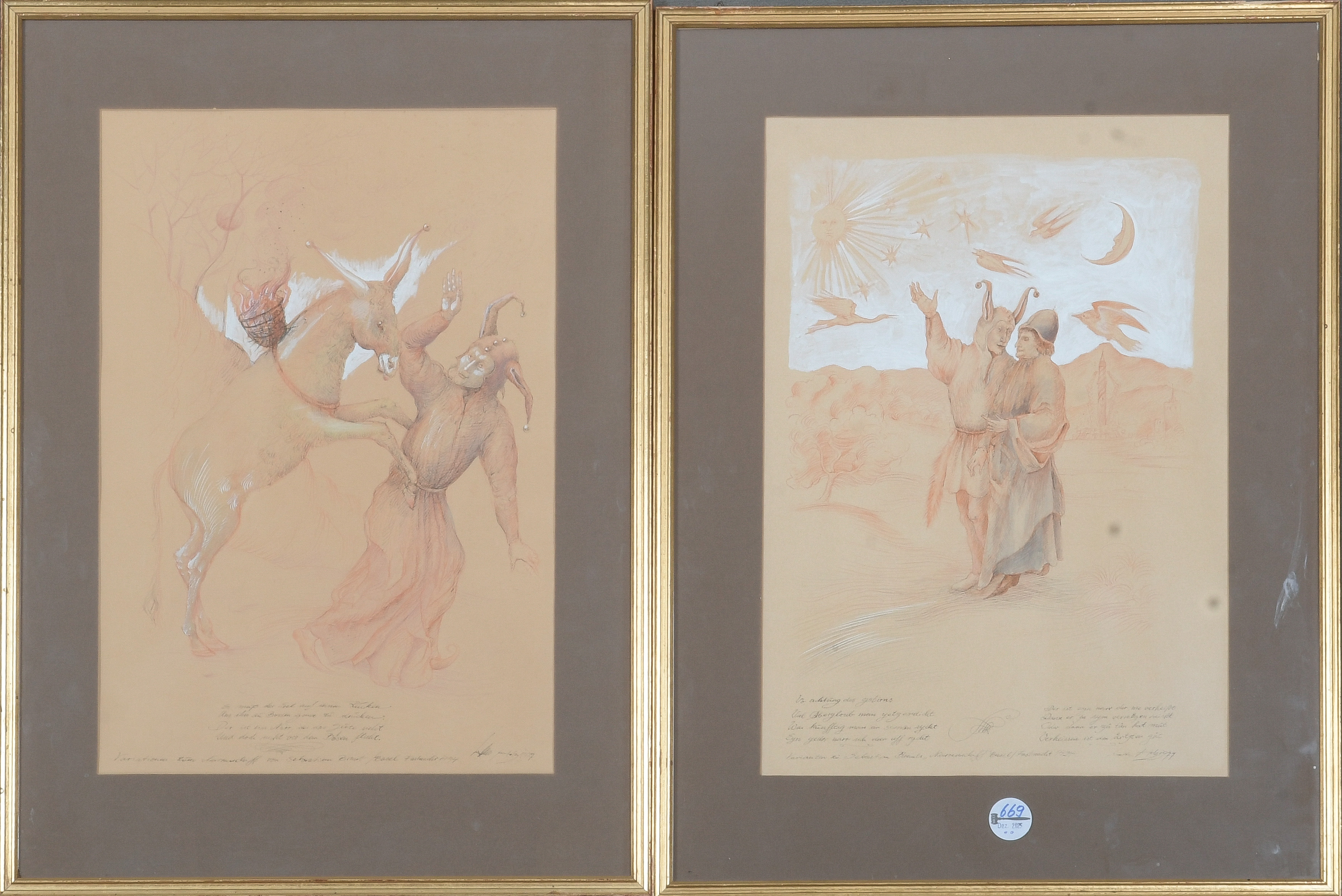 - Katalog-Nr: 669Werner Holz (1948-1991). „Variation zum Narrenschiff von Sebastian Brant Basel Fastnacht 1494“ und „Variation zu Brants Narrenschiff Basel Fastnacht 1494“, re./u./sign./dat. 1977, je mit Passepartout hi./Gl. gerahmt, 48,5 x 33,5 cm.o.L.