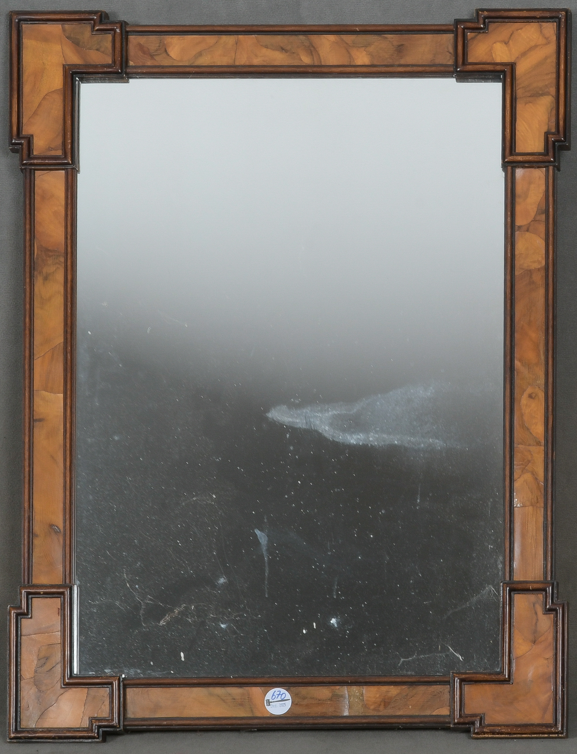 - Katalog-Nr: 670Spiegel. Deutsch 20. Jh. Nussbaum furniert, teilw. massiv; verkröpfter, profilierter Rahmen, 86 x 64,5 cm.o.L.