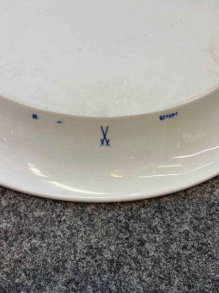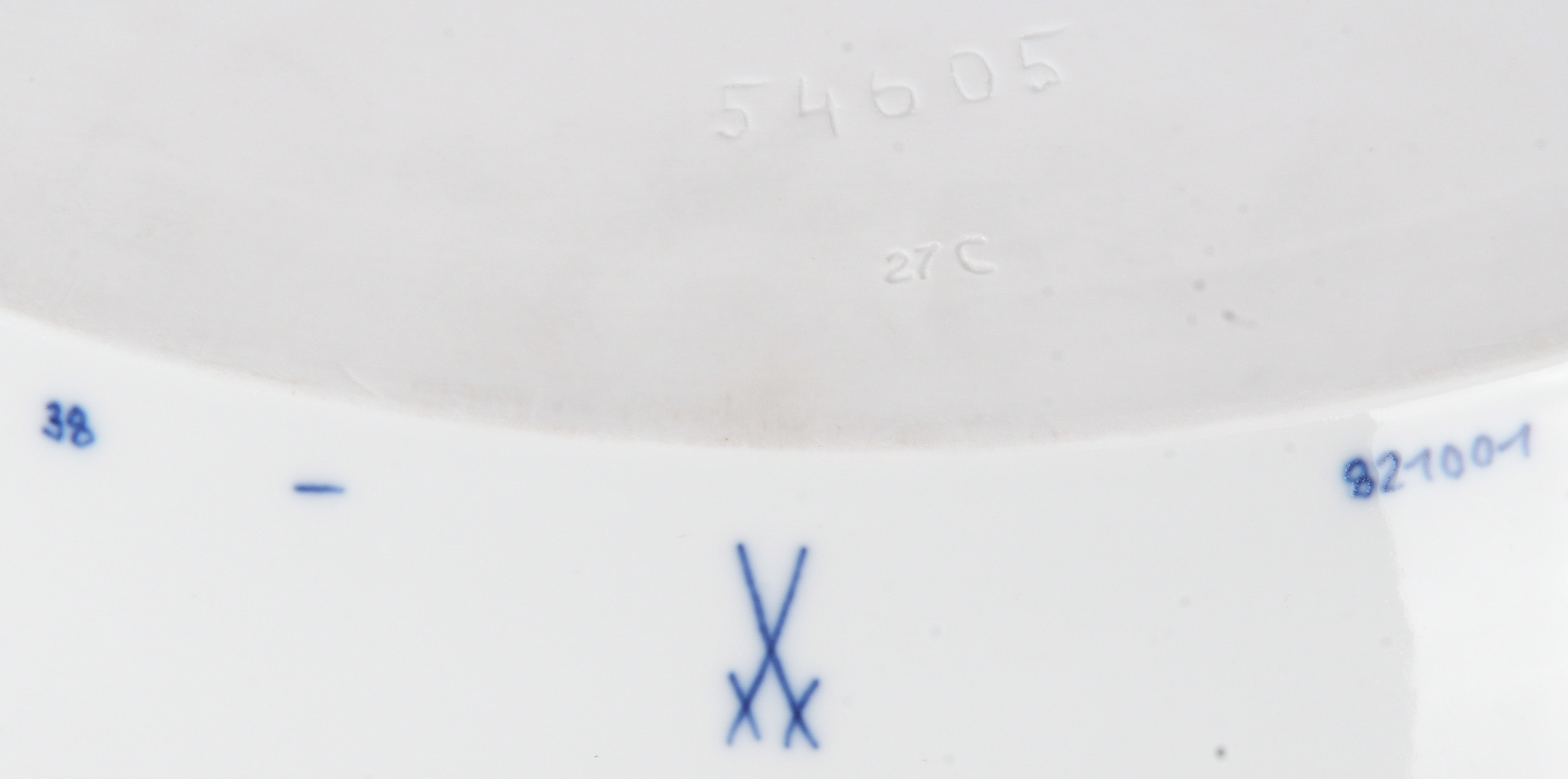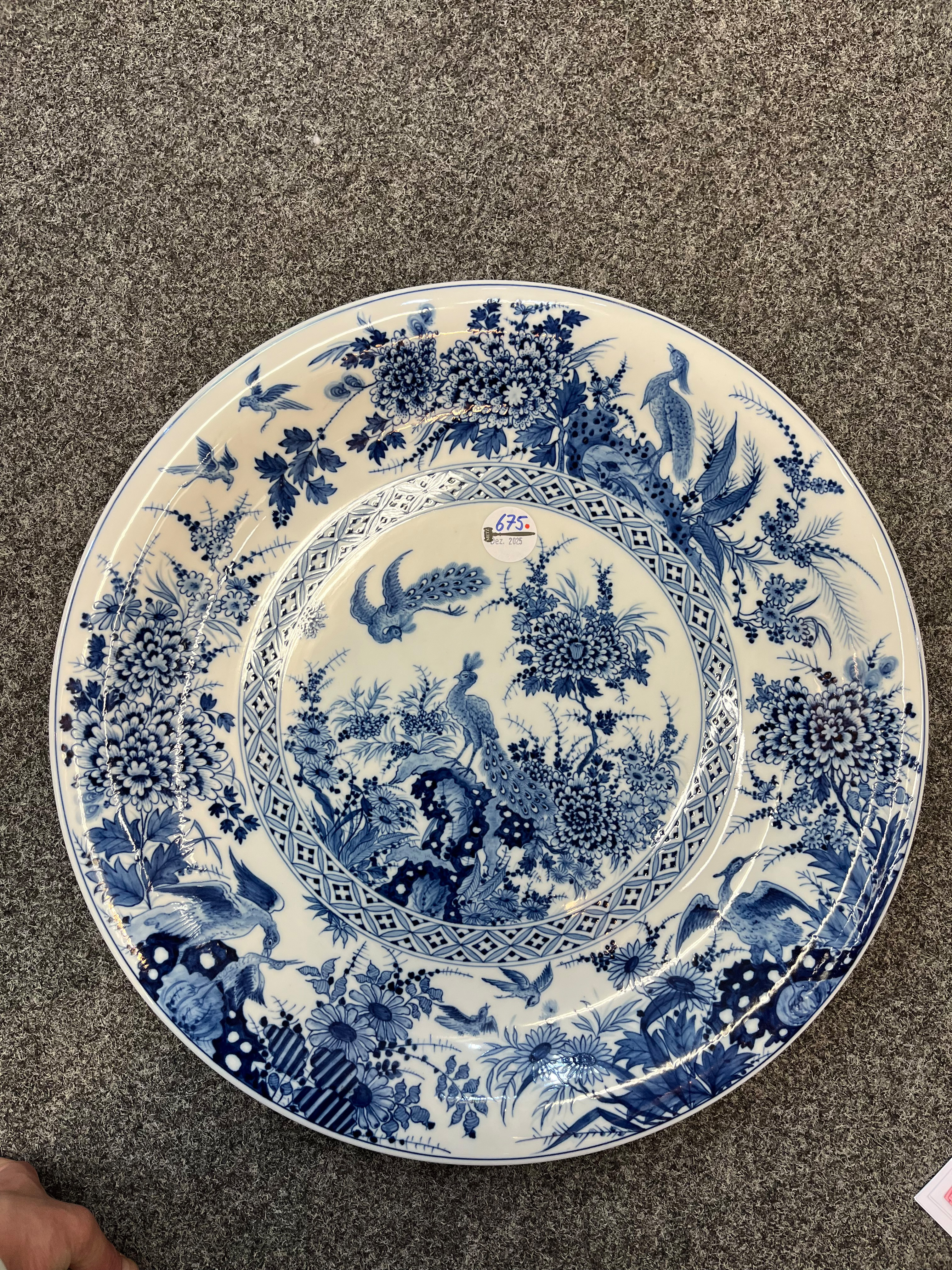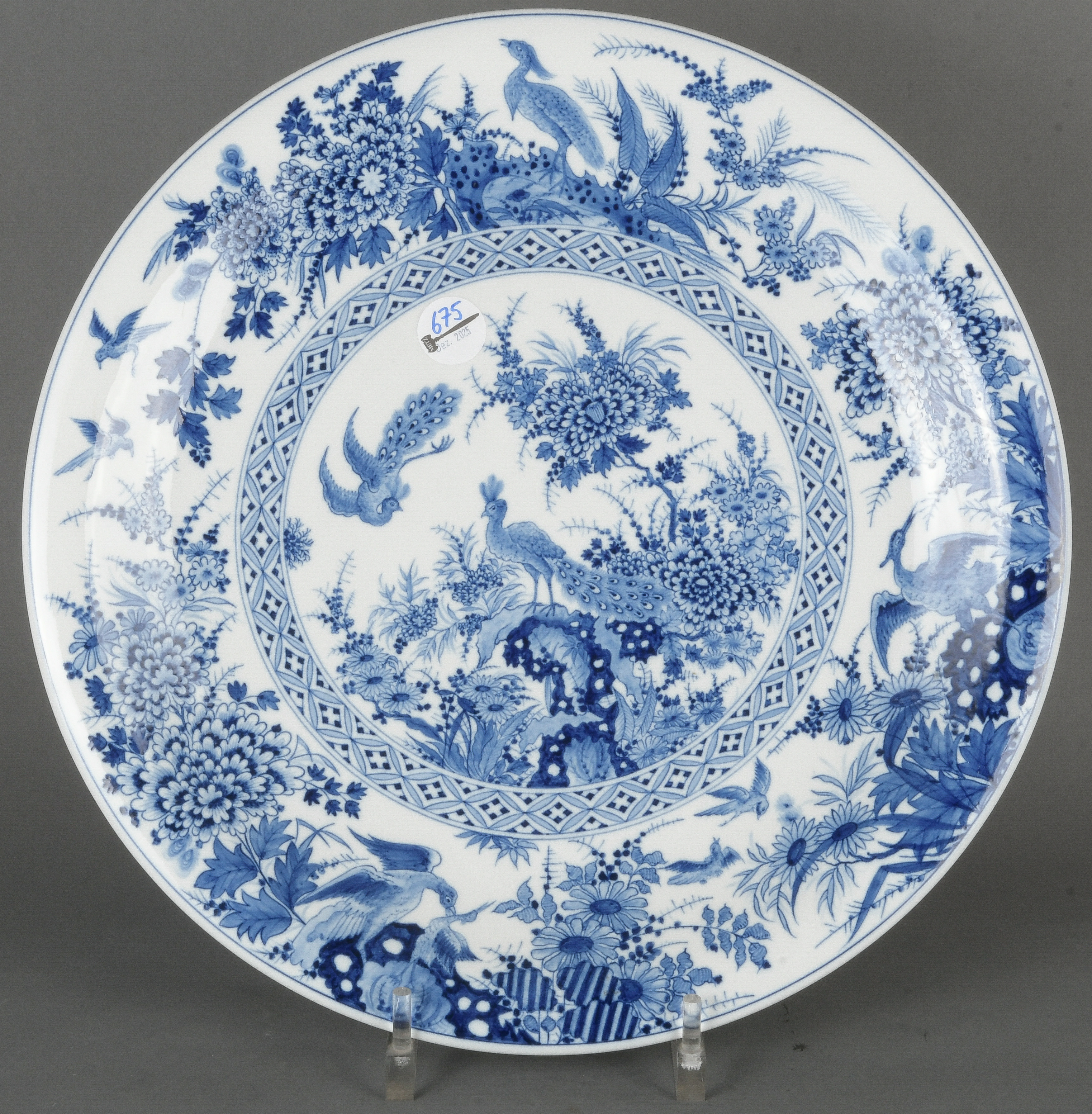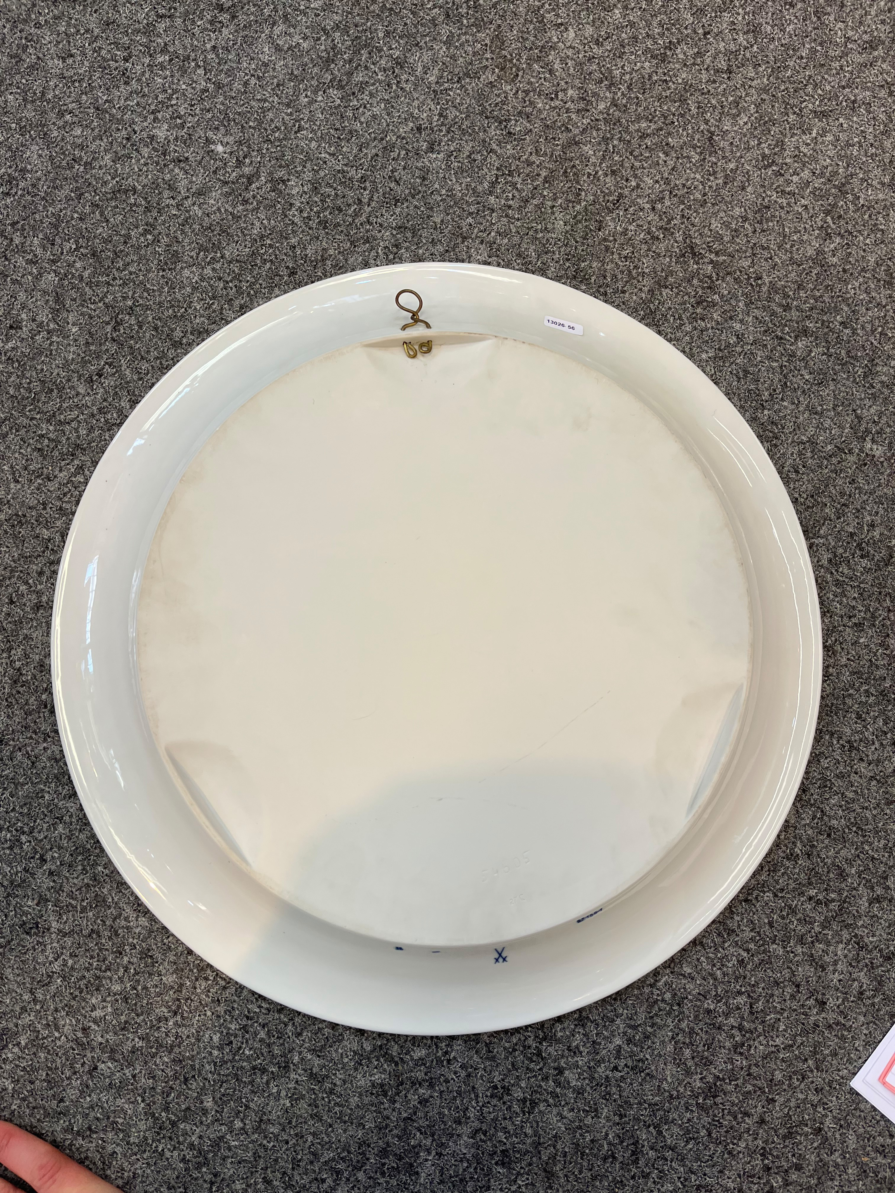 - Katalog-Nr: 675Große, runde Wandplatte. Meissen 20. Jh. Porzellan, unterglasurblau bemalt mit Floraldekor und Paradiesvögeln; verso unterglasurblaue Schwertermarke, D=46,5 cm.o.L.