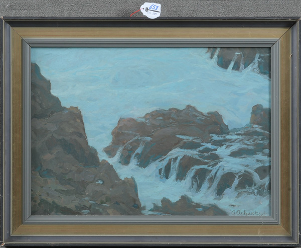 - Katalog-Nr: 653Gabrielle Achenbach (1871-1956). Felsige Küste mit Brandung. Öl/Hartfaser, re./u./sign., gerahmt, 35 x 48 cm.o.L.
