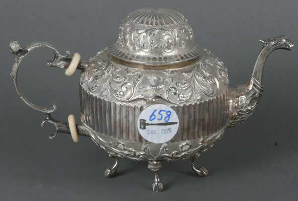 - Katalog-Nr: 658Teekanne. Wohl Amsterdam 18. Jh. Silber, ca. 364 g, am Boden mehrfach gepunzt mit Stadt- und Meistermarke, H=15 cm.o.L.