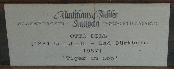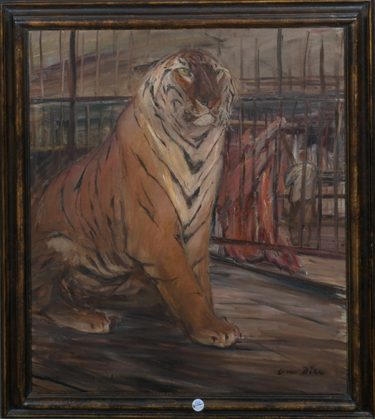 - Katalog-Nr: 666Otto Dill (1884-1957). Sitzender Tiger im Käfig. Öl/Lw., re./u./sign., gerahmt, 105 x 87 cm. Provenienz: Galerie Bühler, Stuttgart.o.L.