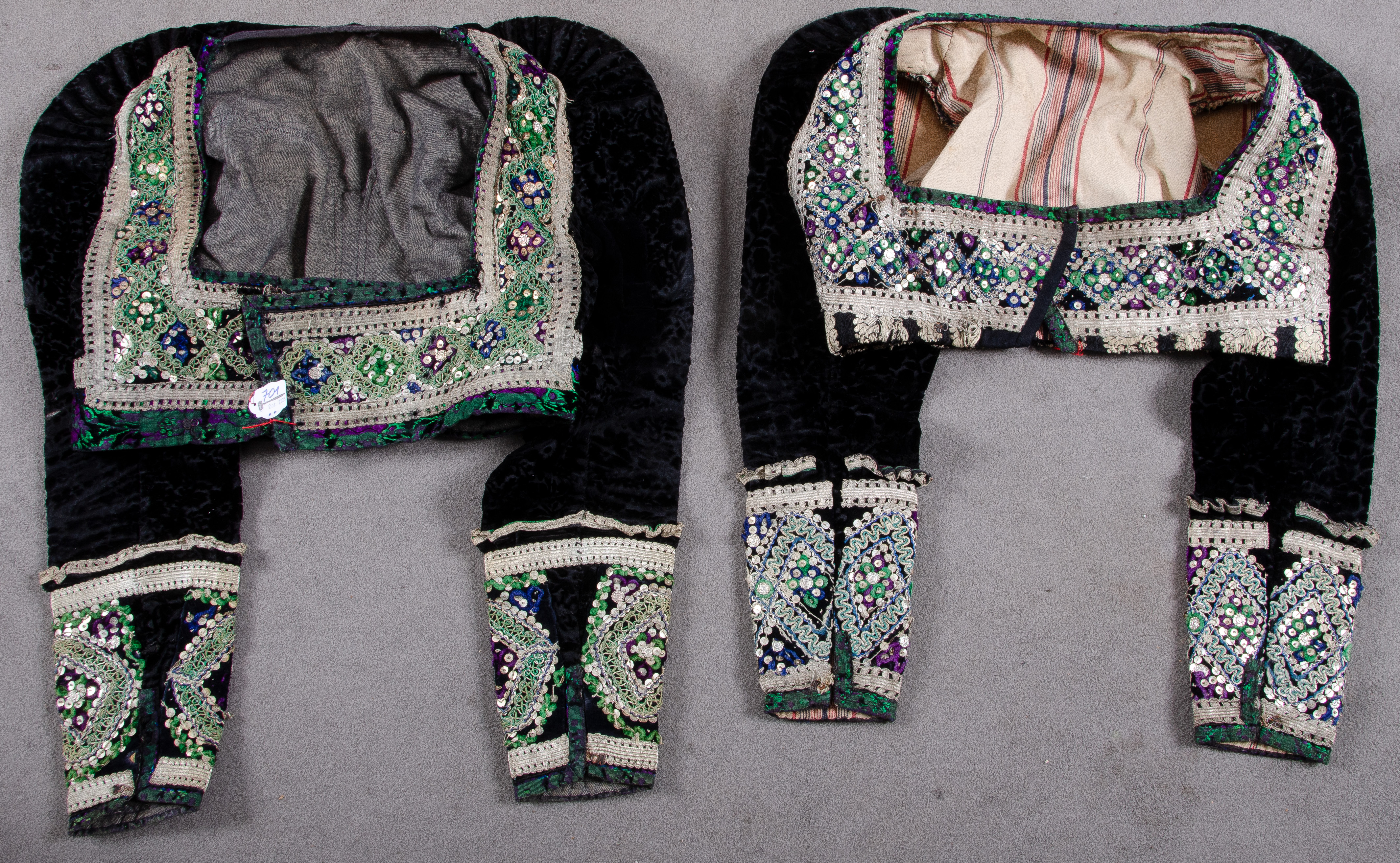 - Katalog-Nr: 702Zwei Trachtenjacken. Wohl Franken. Schwarzer Stoff, mit buntem und Goldfaden bestickt mit Blumen und Strasssteinen.o.L.