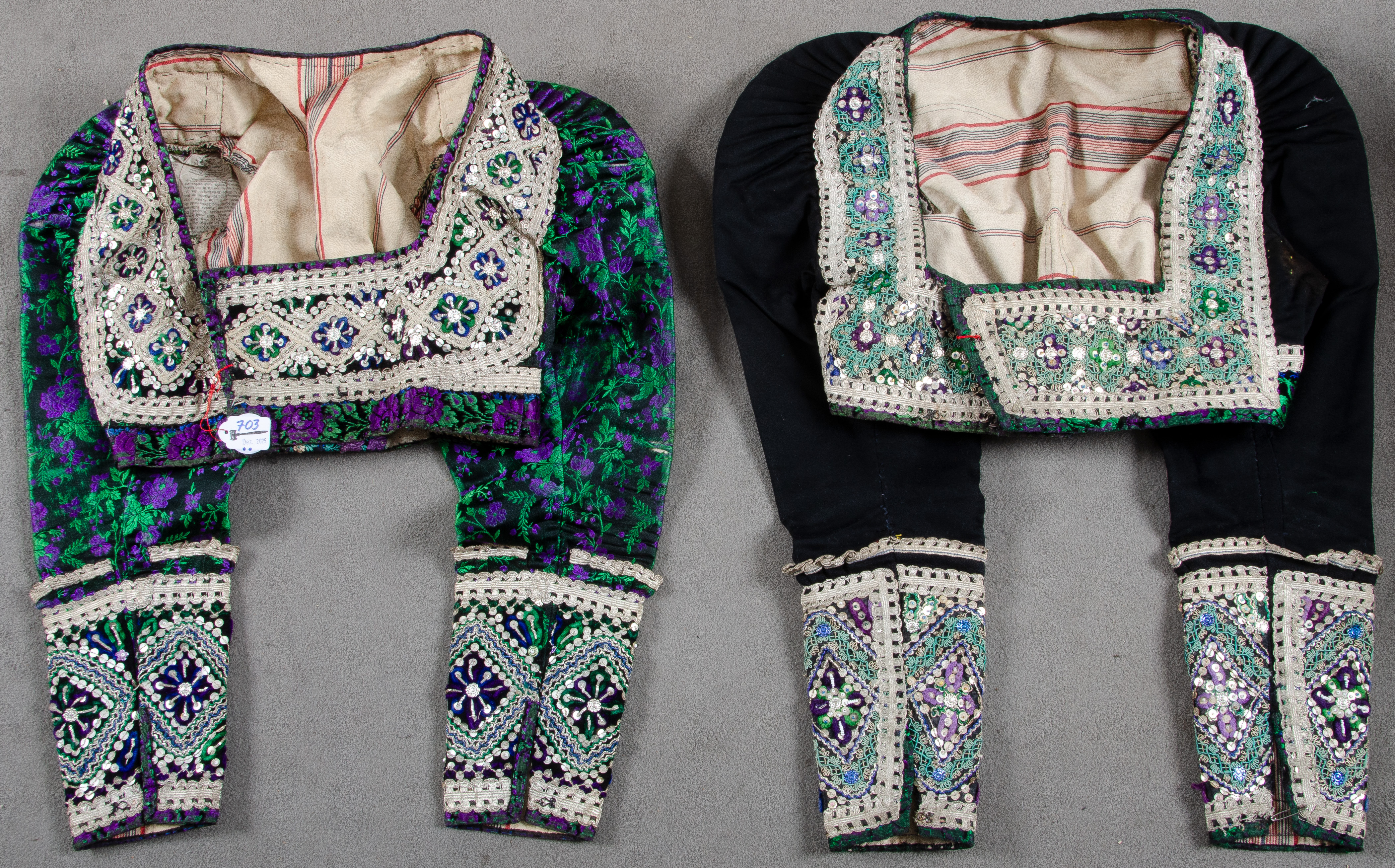 - Katalog-Nr: 703Zwei Trachtenjacken. Wohl Franken. Schwarzer / grün-lilafarbener Stoff, mit buntem und Silberfaden bestickt mit Blumen und Strasssteinen.o.L.