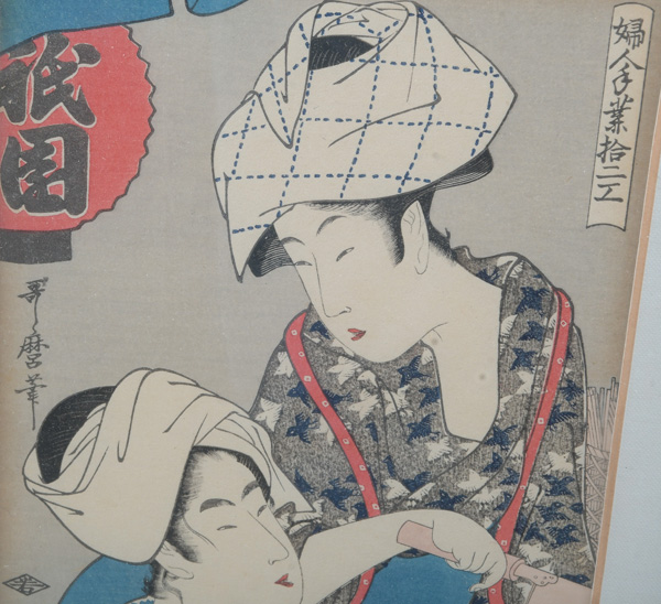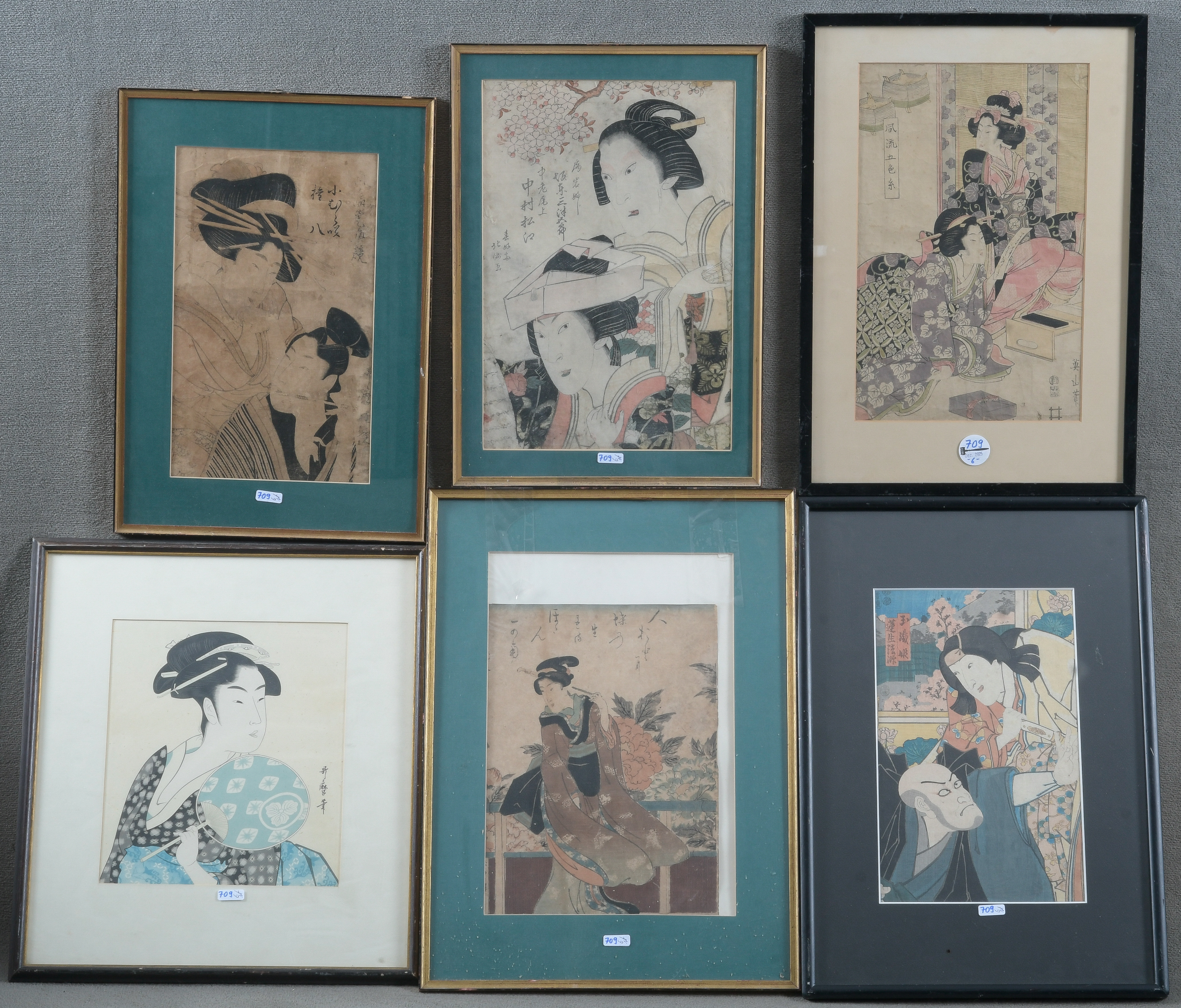 - Katalog-Nr: 709Japanischer Graphiker des 20. Jhs. Sechs Porträts und Theaterszenen. Colorierte Holzschnitte, re./o. bzw. u./mittig/sign., mit Passepartout hi./Gl. gerahmt, 26 x 23 bis 35,5 x 22 cm.o.L.