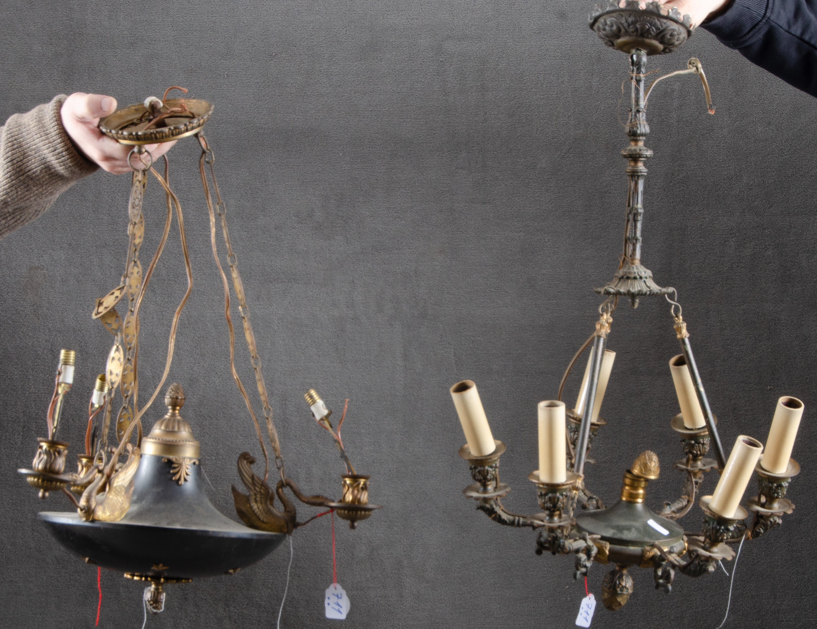 - Katalog-Nr: 711Zwei Deckenlampen im Empirestil, drei- bzw. sechsflammig. Messing- / Metallgestell, teilw. verziert mit Schwanenköpfen, H=69 cm, D=37,5 cm / H=57 cm, D=41 cm. (Funktion ungeprüft)o.L.