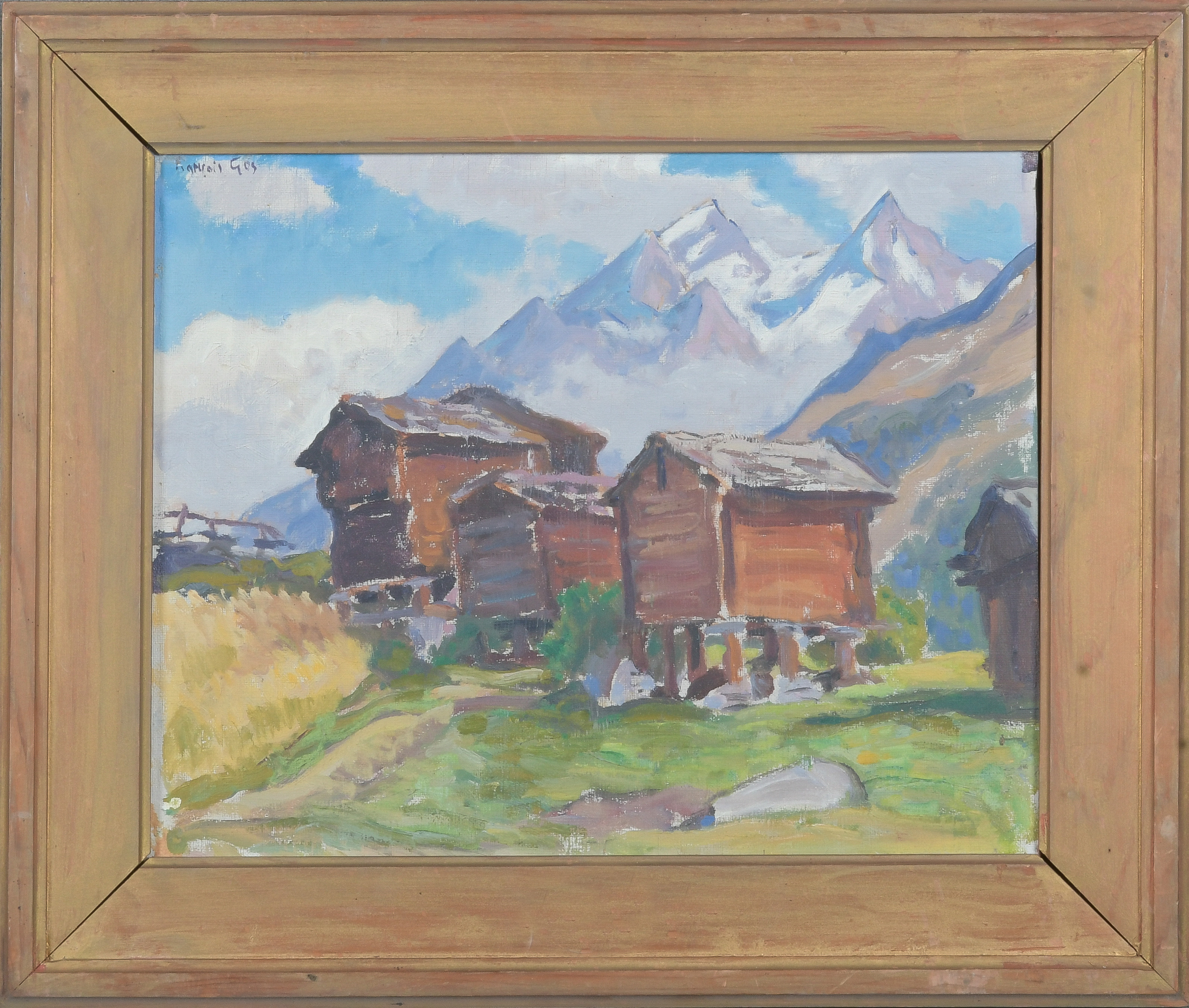- Katalog-Nr: 717François Gos (1880-1975). Alpenlandschaft mit Berghütten. Öl/Lw., li./o./sign., gerahmt, 32 x 40 cm.o.L.