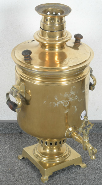 - Katalog-Nr: 707Samowar. Tula/Russland, Fabrik I.F. Kapyrsin 1888. Messing, mit verschiedenen Punzen von 1888 bis 1904, u.a. mit Auszeichnung von der Weltausstellung Paris 1900, H=56 cm. (Kanne fehlt)o.L.