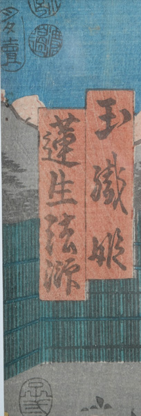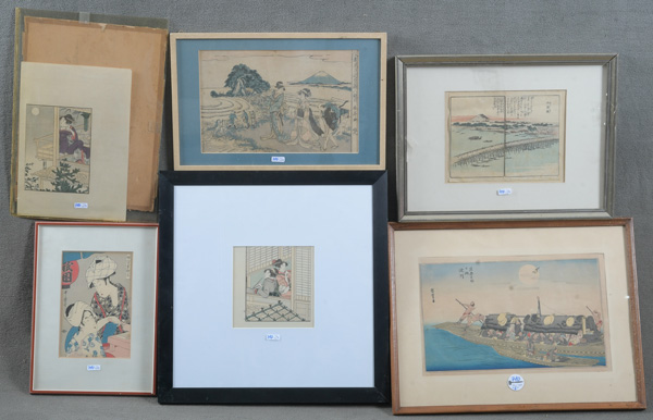 - Katalog-Nr: 710Japanischer Graphiker des 20. Jhs. Landschaft mit Personenstaffage, Küstenlandschaften und wohl Theaterszene. Sechs colorierte Holzschnitte, re. bzw. li./mittig/sign., mit Passepartout hi./Gl. gerahmt, 15 x 13 bis 21 x 35 cm.o.L.
