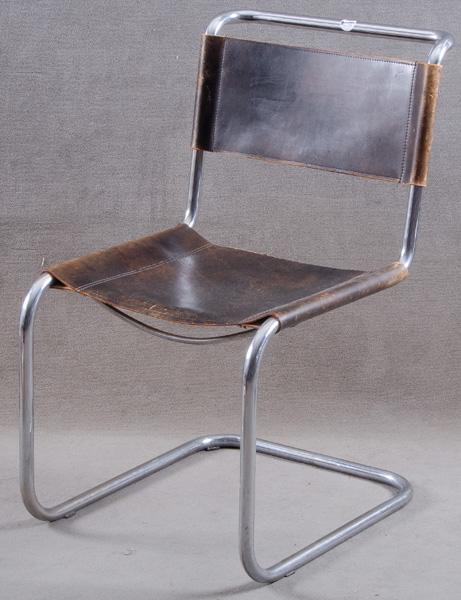 - Katalog-Nr: 713Freischwinger-Schreibtischstuhl. Thonet „B33“, Chromgestell mit Ledersitz und -rücken, Entwurf Marcel Breuer.o.L.
