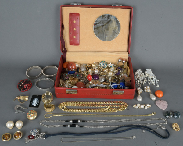 - Katalog-Nr: 722Konvolut Modeschmuck, u.a. Armbänder, Broschen, Halsketten (L=42 bis 88 cm) und Ohrclips. Silber, teilw. mit Steinbesatz.o.L.