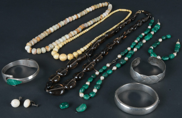 - Katalog-Nr: 724Konvolut Schmuck: Drei Armreife, ein Armband, vier Halsketten und ein Paar Ohrstecker. Teilw. Silber, besetzt mit Malachit, Gesamtgewicht ca. 97,59 g bzw. mit Malachit-, weißen Onyxkugeln und Perlen sowie zwei lose Steine, L=49 bis 62 cm. (eine Kette besch.)o.L.