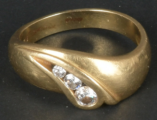 - Katalog-Nr: 725Damenring. 18 kt Gold, besetzt mit drei Brillanten, ca. 0,25 ct, Gesamtgewicht ca. 7,87 g, Ringgröße 61.o.L.