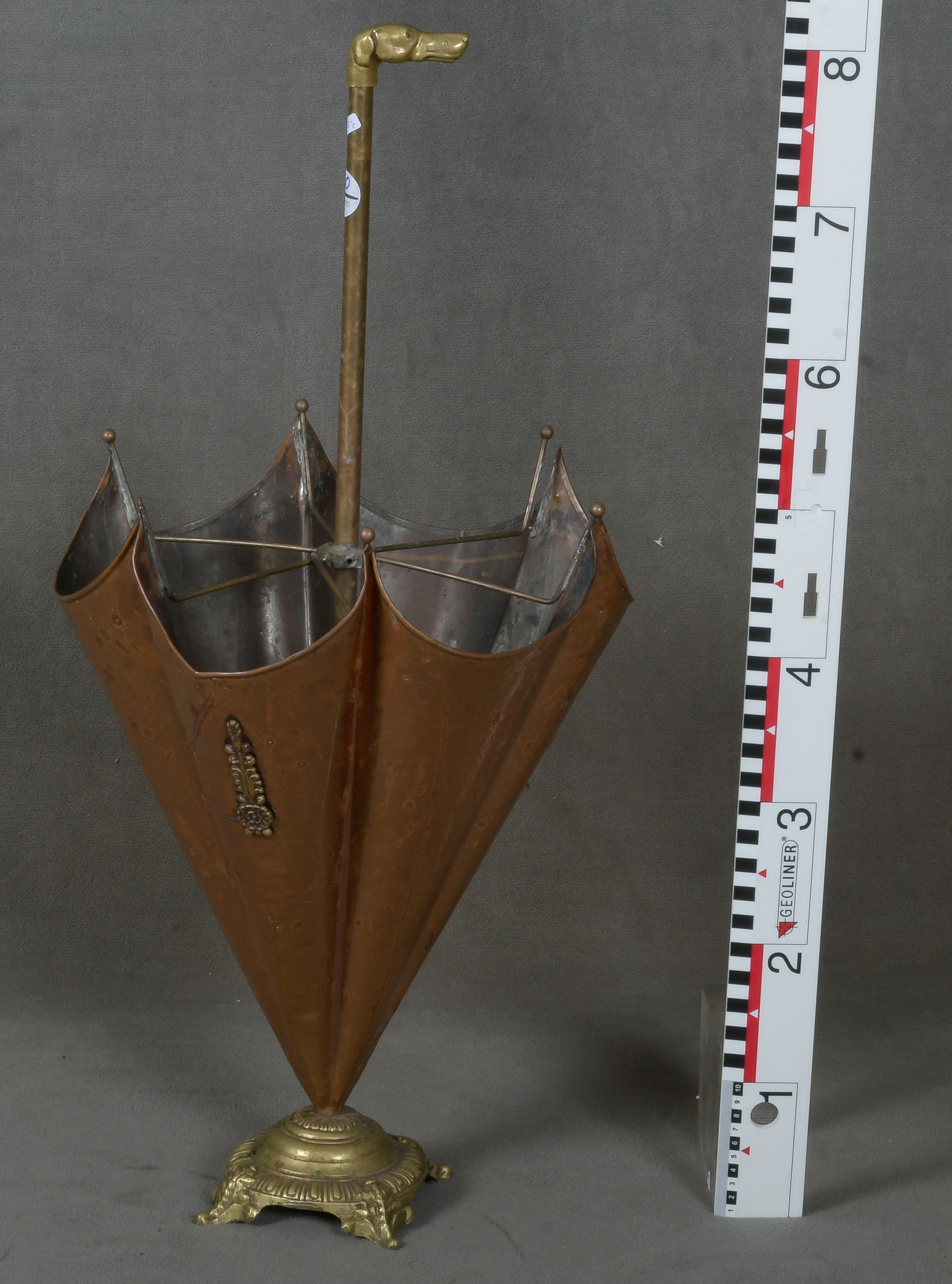 - Katalog-Nr: 80Schirmständer. Wohl England 20. Jh. Messing; vierpassiger Fuß mit offenem Schirm und Hundekopfknauf, H=83 cm, D=38 cm.o.L.