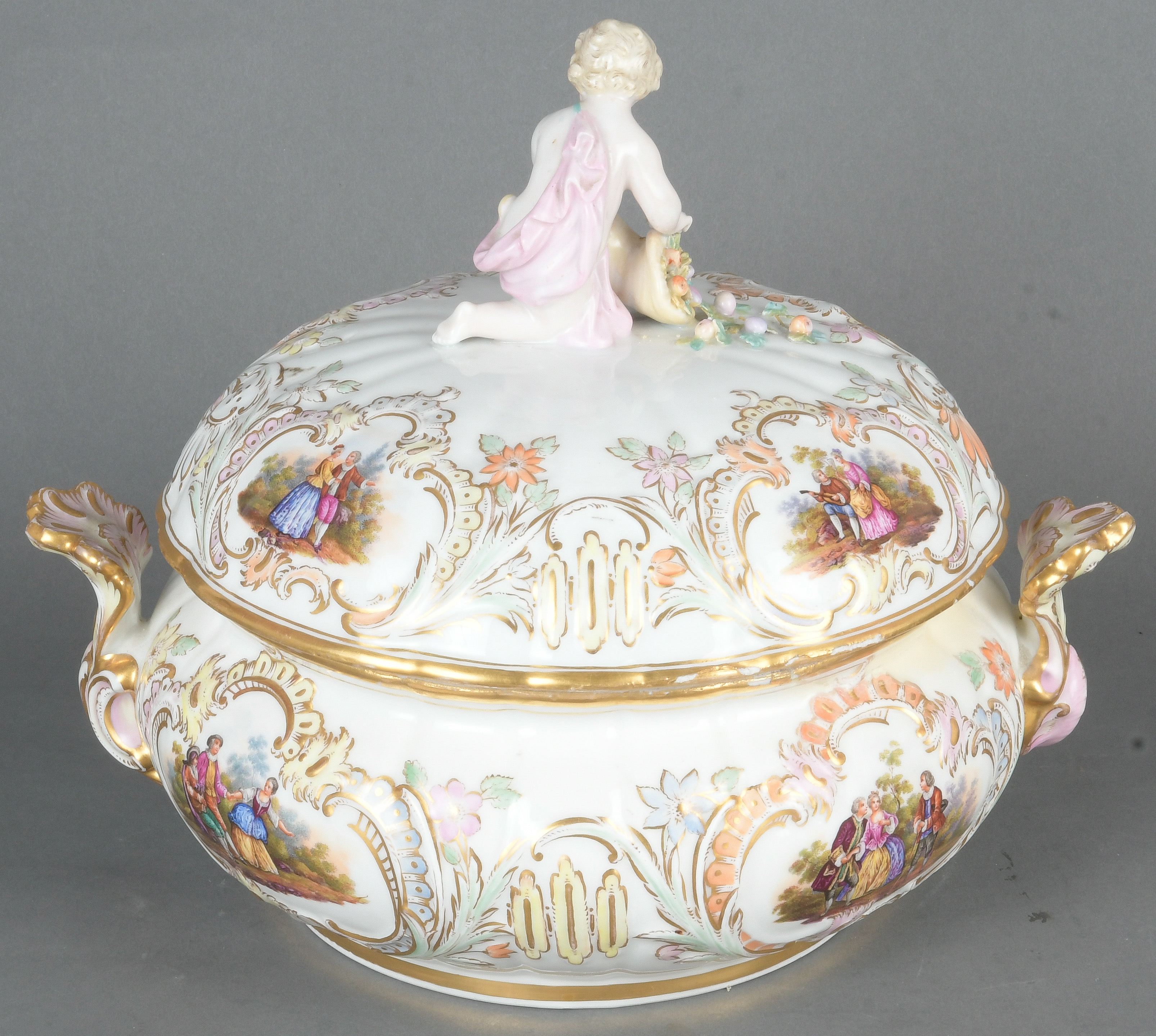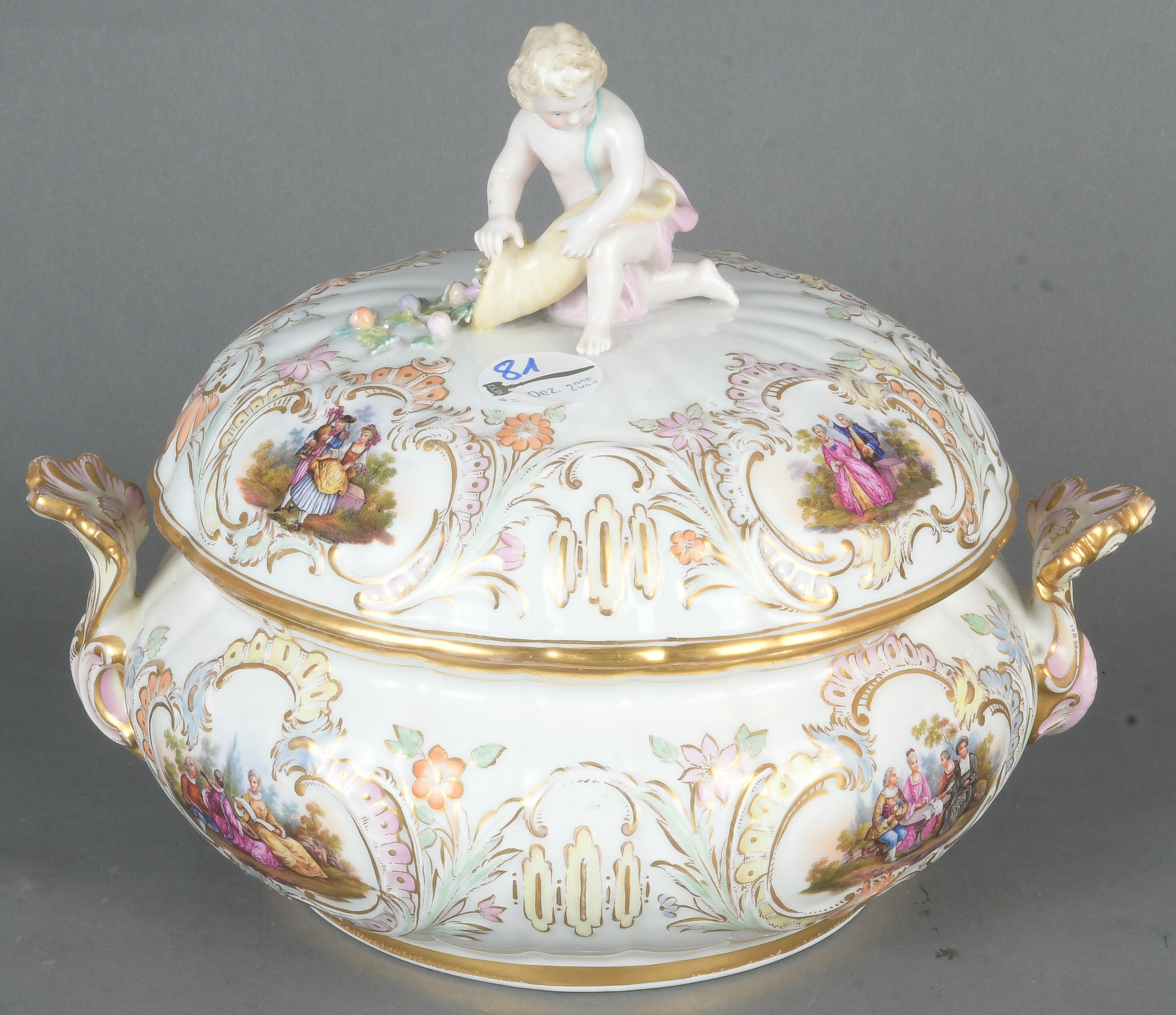 - Katalog-Nr: 81Deckelterrine "Dulongrelief". Meissen 19. Jh. Porzellan, aufwendig reliefiert mit Rocaillekartuschen, gold gesäumt, die Reserven bunt bemalt mit Watteauszenen in Parklandschaft; am Boden unterglasurblaue Schwertermarke mit zwei Schleifstrichen, H=25 cm, D=22 cm.o.L.