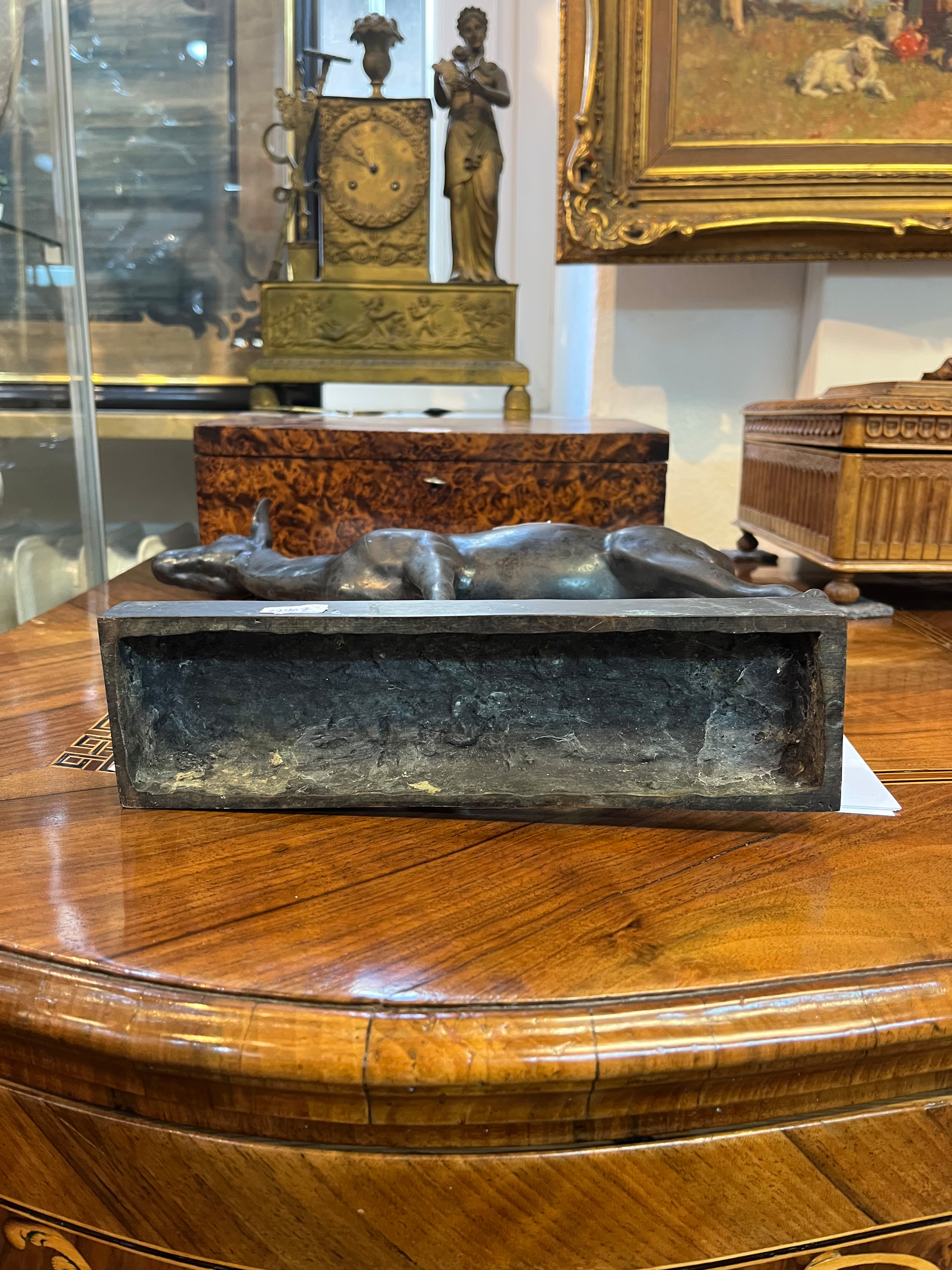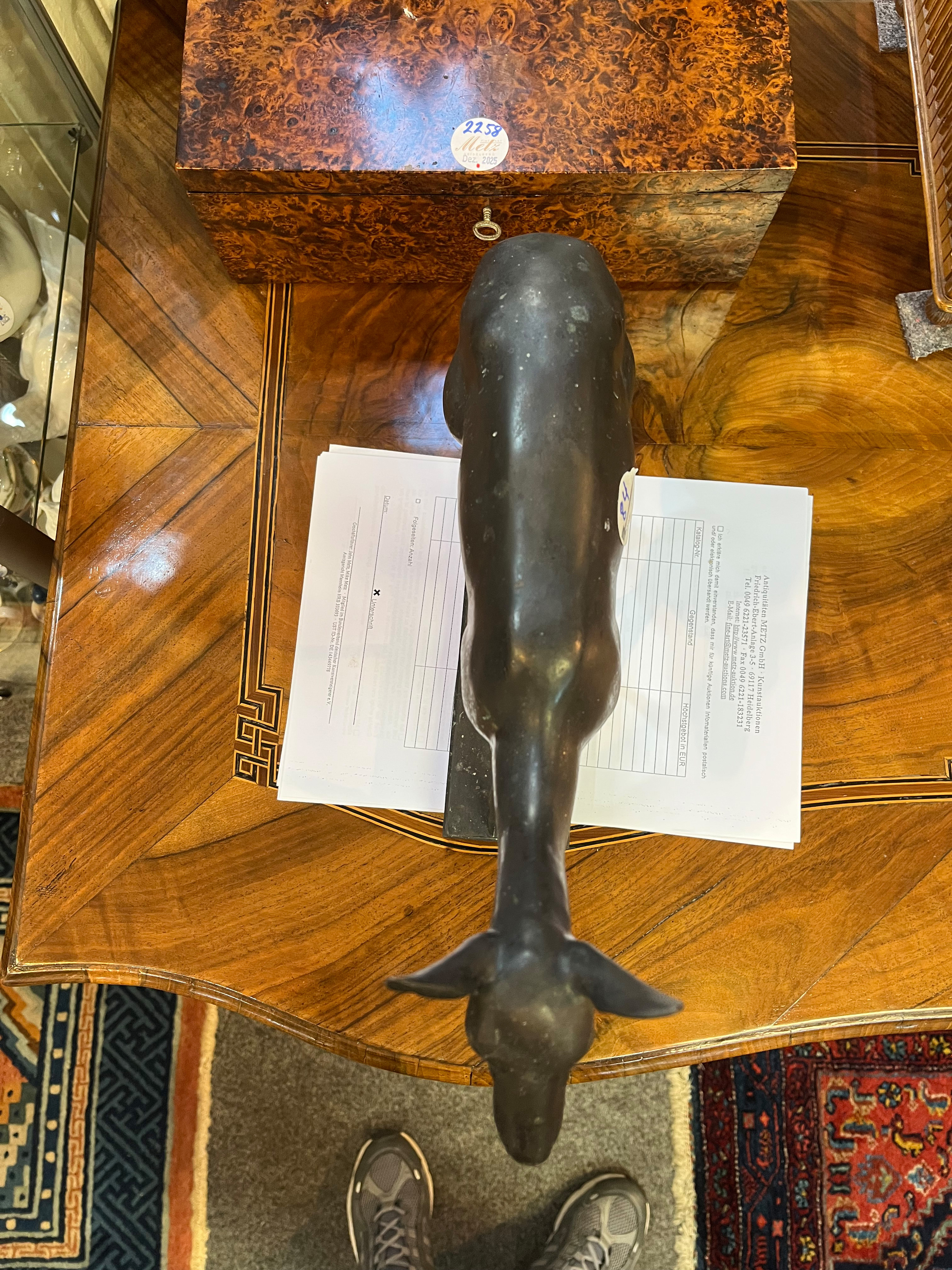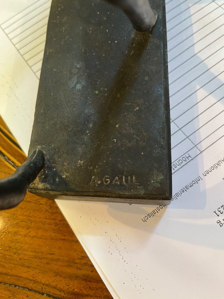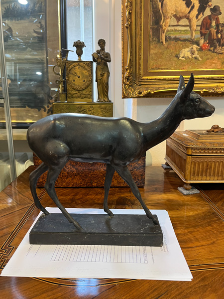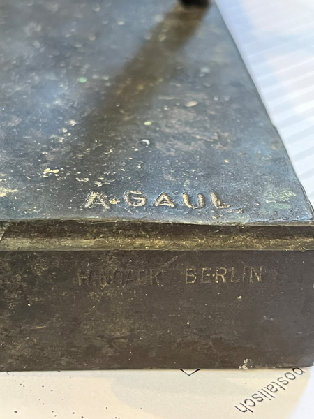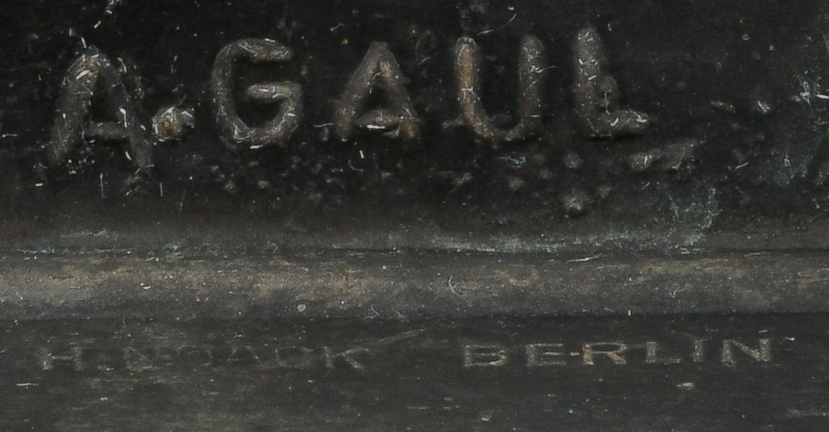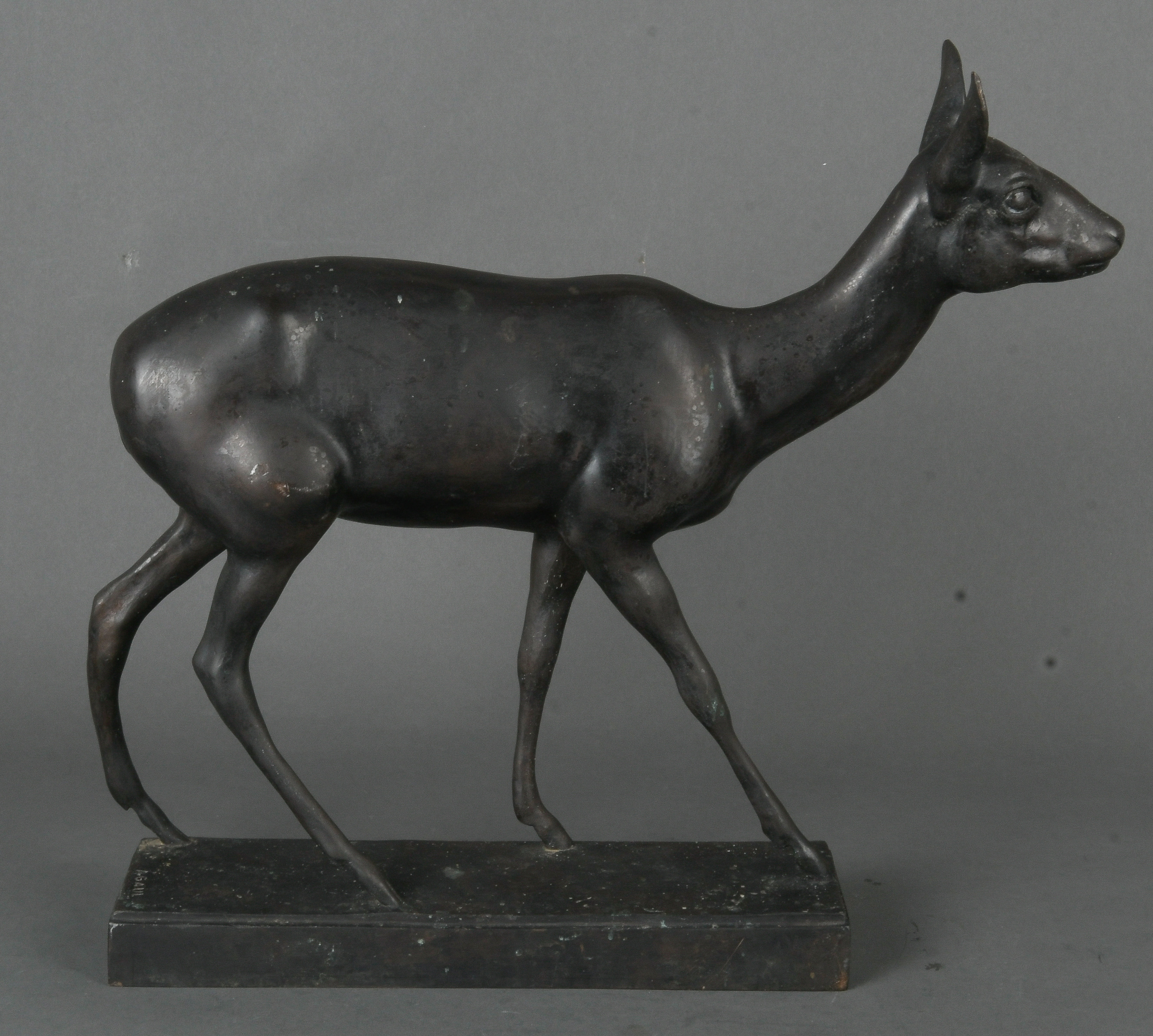 - Katalog-Nr: 84August Gaul (1869-1921). Schreitendes Reh. Bronze, auf der Plinthe sign., mit Gießerstempel „H.(ermann) Noack, Berlin“, H=31 cm. Die Plastik des „Stehenden Rehs“ und „Großen sichernden Rehs“ entstand als Vorarbeit zu einem unausgeführt gebliebenen Denkmal für den 1908 verstorbenen Maler Walter Leistikow. Durch die gemeinsame Arbeit in der Berliner Sezession und im künstlerischen Ansatz der Naturdarstellung mit Leistikow eng vertraut, wurde Gaul mit dem Denkmalsentwurf beauftragt. Die Planungen des Bildhauers sahen eine langgestreckte Bankanlage aus Stein vor, darin, auf einer mittig erhöhten Stele, das Porträtrelief Leistikows sowie zwei flankierende Rehe an beiden Enden der Anlage (WVZ Gabler 2007, 188–190). Aus diesem Werkkontext haben sich sowohl Güsse der beiden kleinformatigen Entwurfsmodelle aus dem Jahre 1913 (WVZ 189, 190) erhalten als auch die für die Denkmalsausführung entsprechend vergrößerten Fassungen (WVZ 253, 254). Im Gegensatz zu seinem Pendant löst das „Große sichernde Reh“ die streng symmetrische Anlage durch eine gezielte Wendung des Kopfes auf und antizipiert in seiner Gestaltung die räumliche Aufstellungssituation: Mit gespitzten Ohren und nach oben gerecktem Maul scheint es wachsam die sich nähernden Betrachter:innen zu wittern, gleichzeitig sind die spitzen Ohren, die filigran modellierten Beine sowie die kompakte silhouettenhafte Form des Körpers ganz auf eine Fernwirkung der Plastik ausgerichtet. Entgegen früheren Angaben sind keine Güsse zu Lebzeiten Gauls gesichert, jedoch war 1921 eine Auflage von fünf Güssen genehmigt worden.o.L.