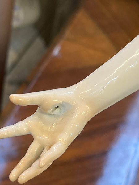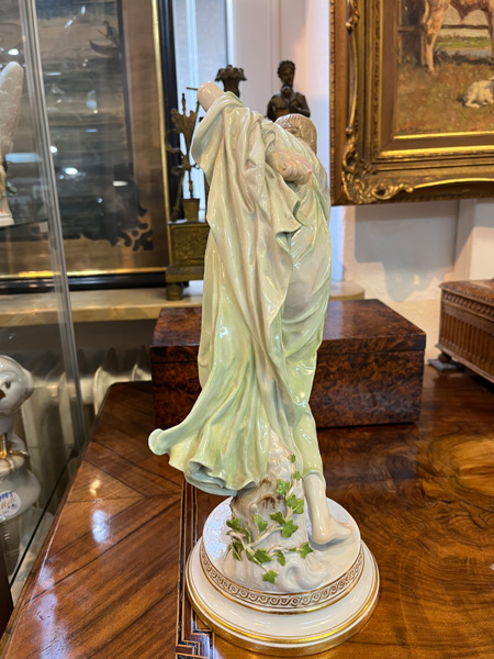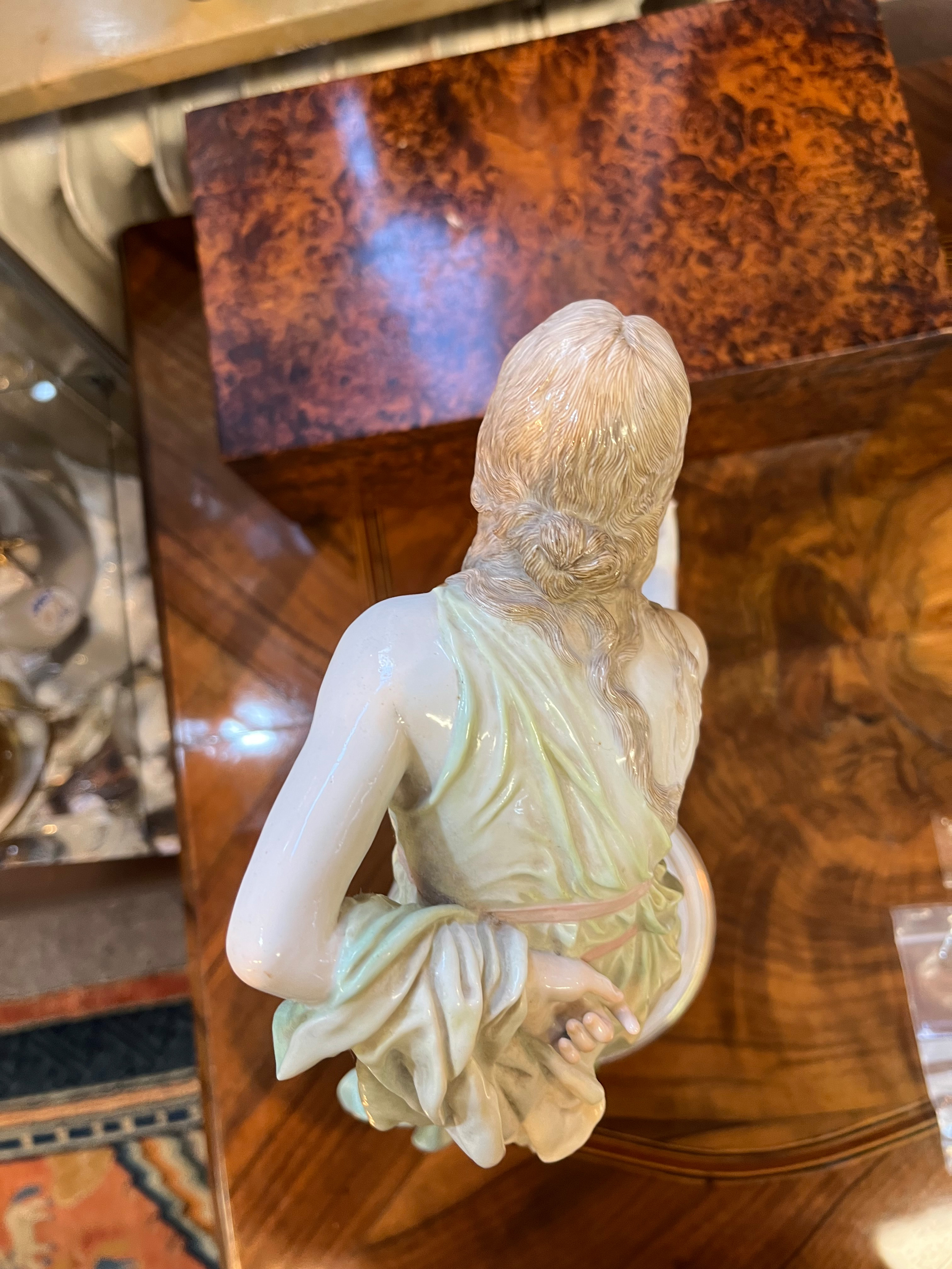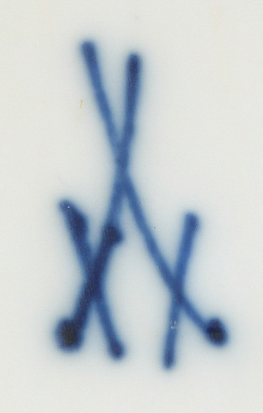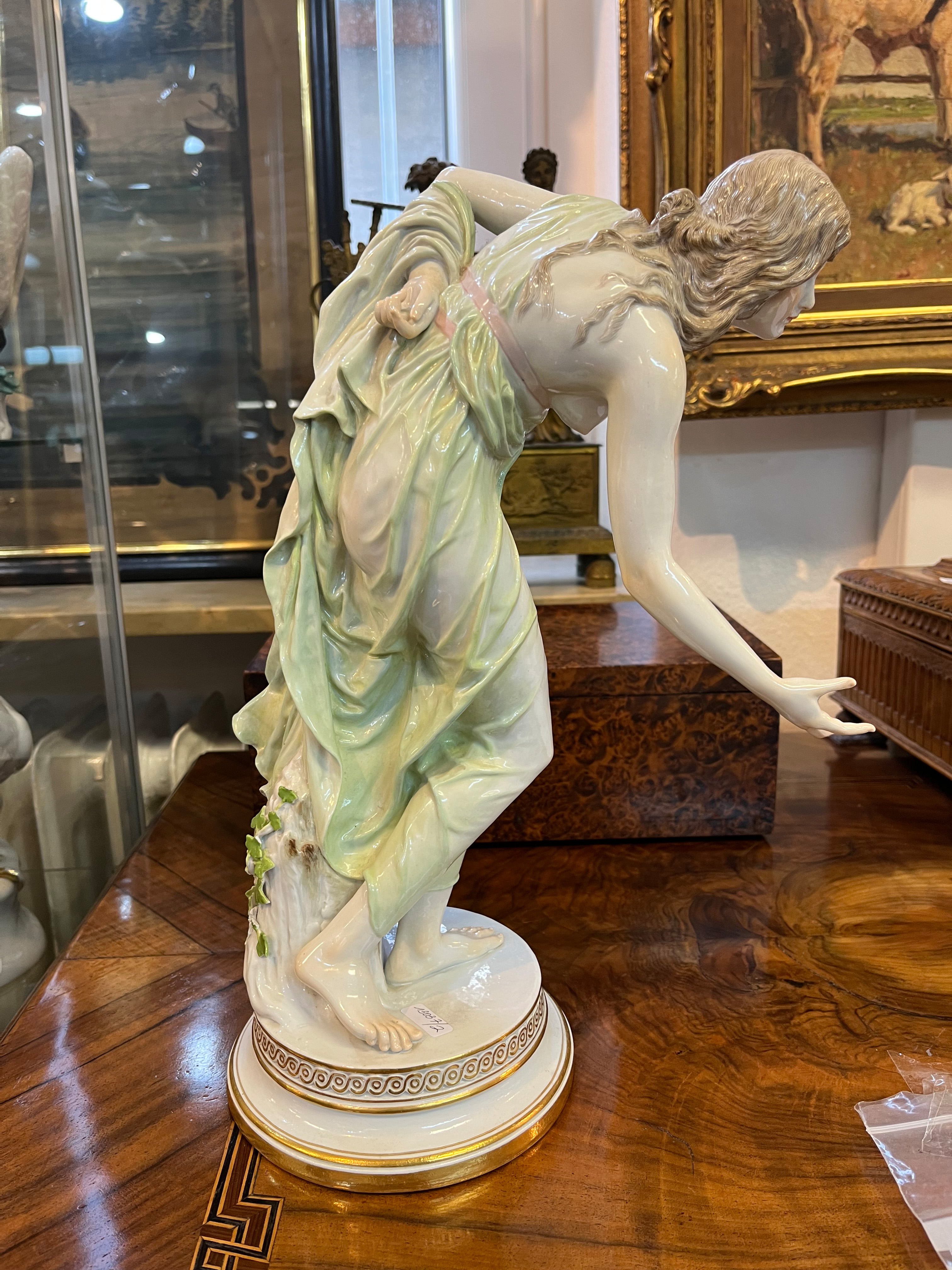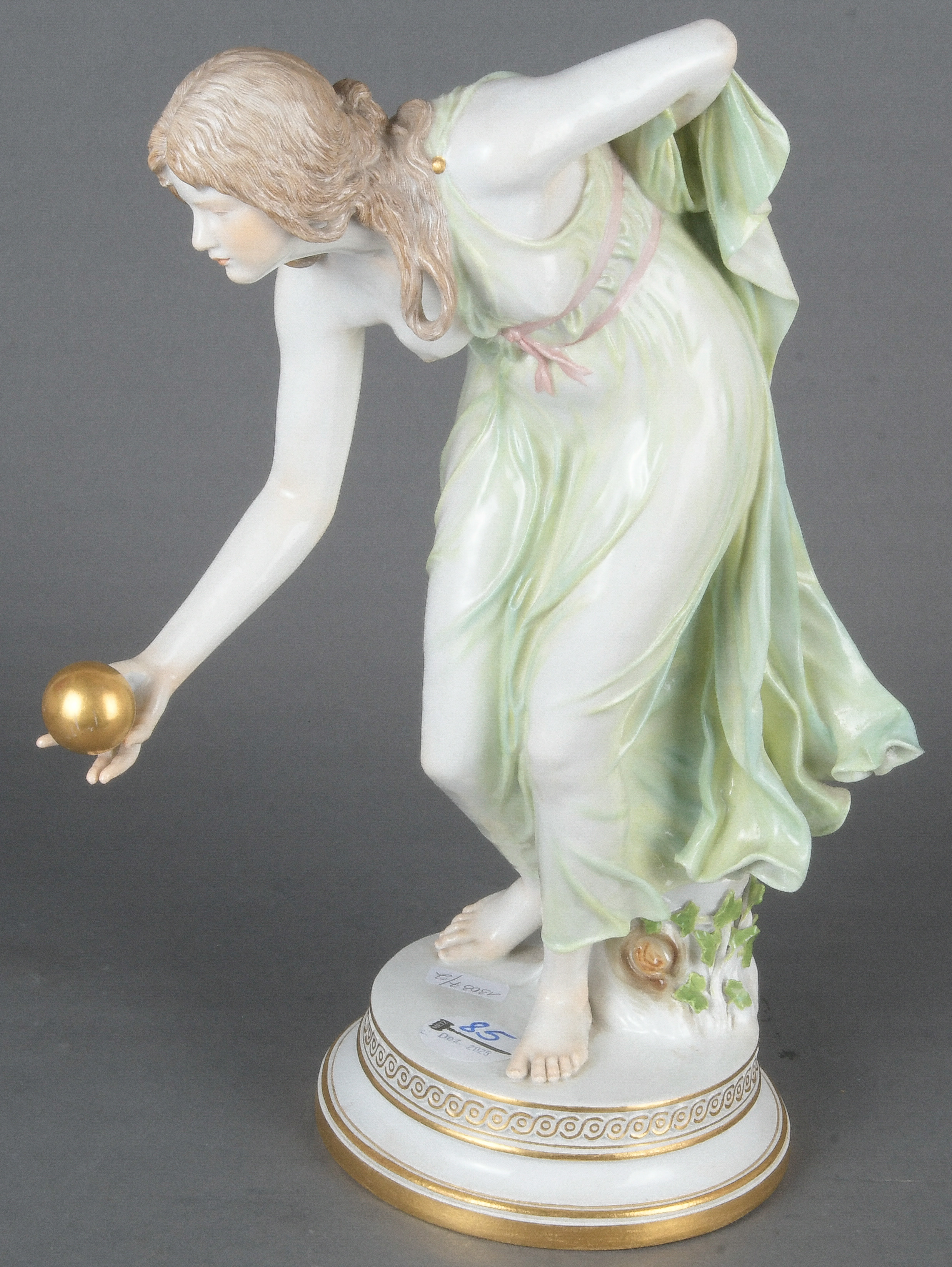- Katalog-Nr: 85Kugelspielerin. Meissen 1897. Porzellan, bunt bemalt; am Boden unterglasurblaue Schwertermarke, Formnummer „Q180“, Staffiererziffer „60“, H=36 cm. (Blätter min. verso best.)o.L.