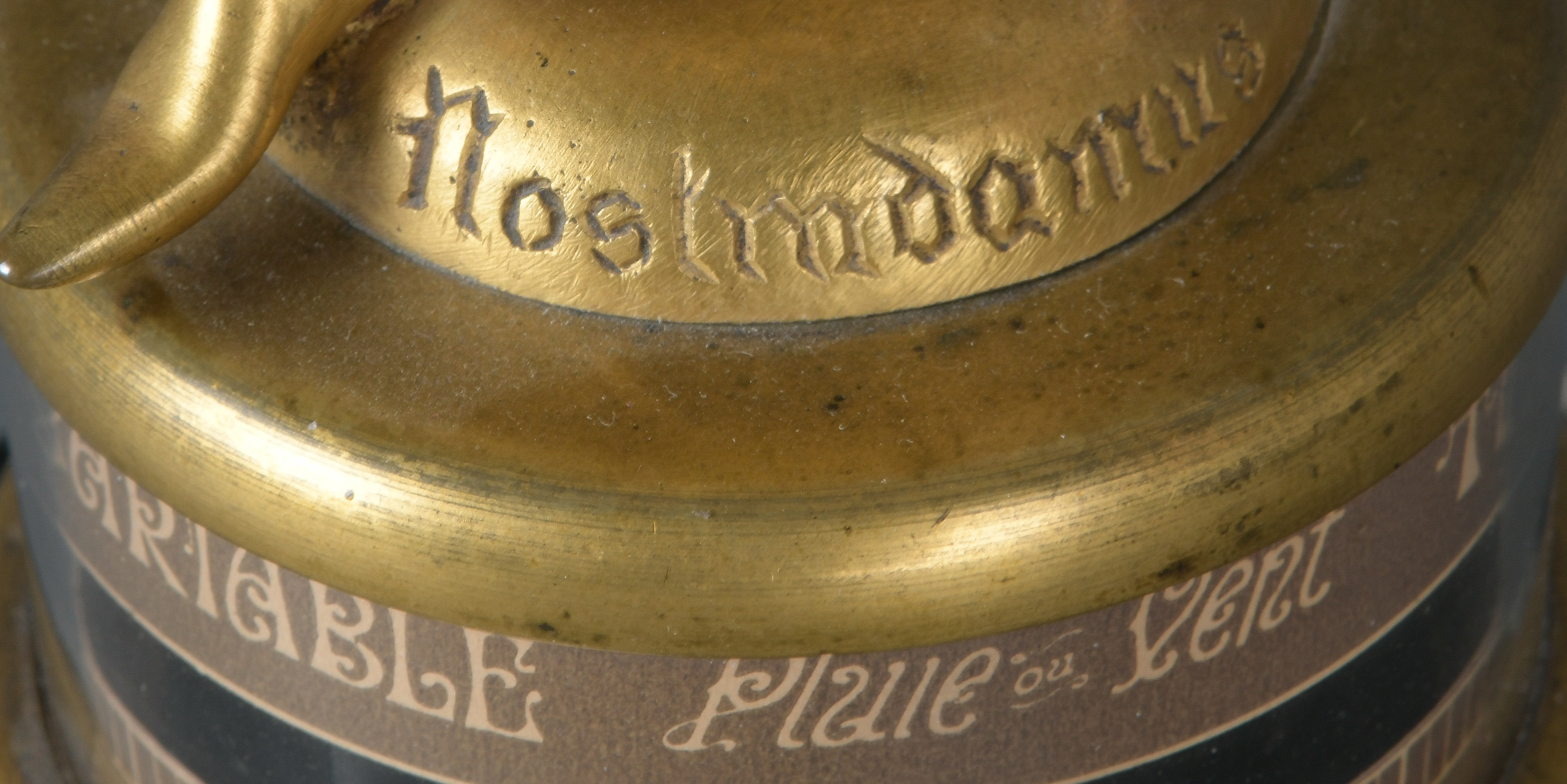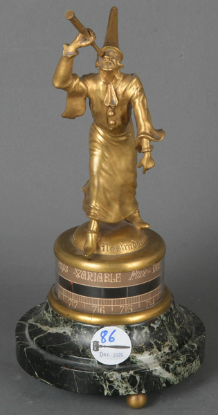 - Katalog-Nr: 86Barometer „Nostradamus“. Frankreich, A. Loir um 1900. Bronzefigur, auf Marmorsockel, seitl. sign., H=31,7 cm. (Funktion ungeprüft)o.L.