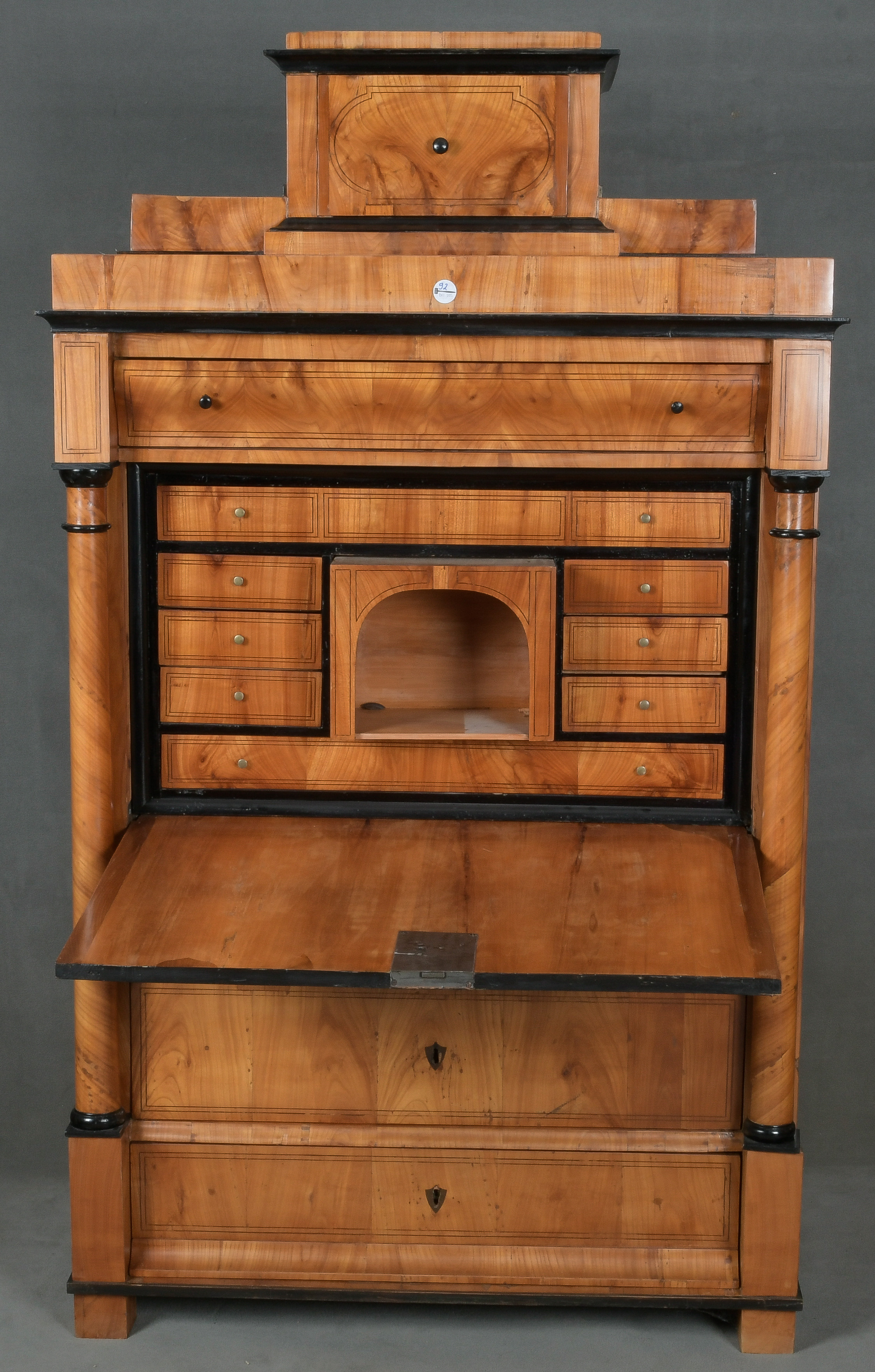 - Katalog-Nr: 92Biedermeier-Standsekretär. Süddeutschland 1815-20. Kirschbaum furniert und teilw. ebonisiert, mit Fadeneinlagen; Klotzfüße, profilierter Sockel, fünfschübig, Schreibklappe mit Inneneinteilung und Geheimfach, profiliertes, getrepptes Abschlussgesims, H=184 cm, B=110 cm, T=53 cm.o.L.
