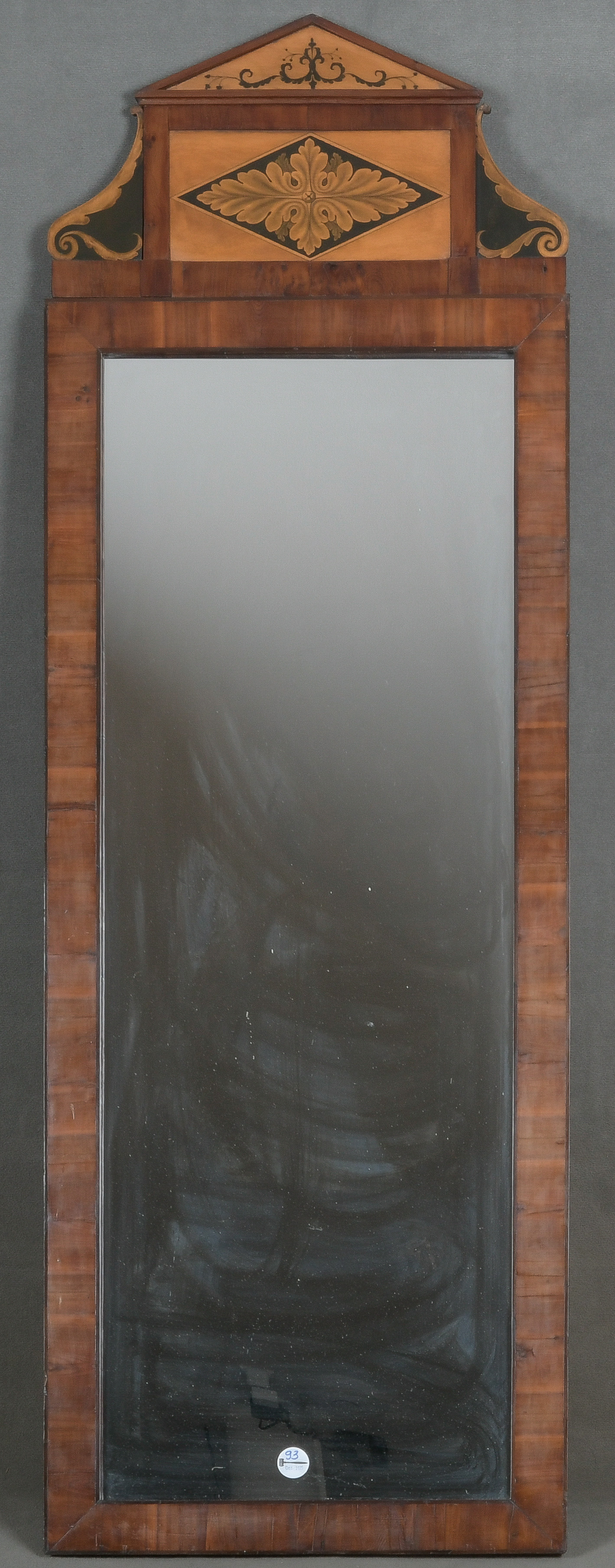 - Katalog-Nr: 93Biedermeier-Spiegel. Norddeutschland 19. Jh. Mahagoni und Birke furniert, teilw. ebonisiert und schattiert mit Blüten, Blattdekor und Rocaillen; rechteckiger Rahmen mit seitl. gebogtem Spitzgiebel, 156 x 52 cm.o.L.
