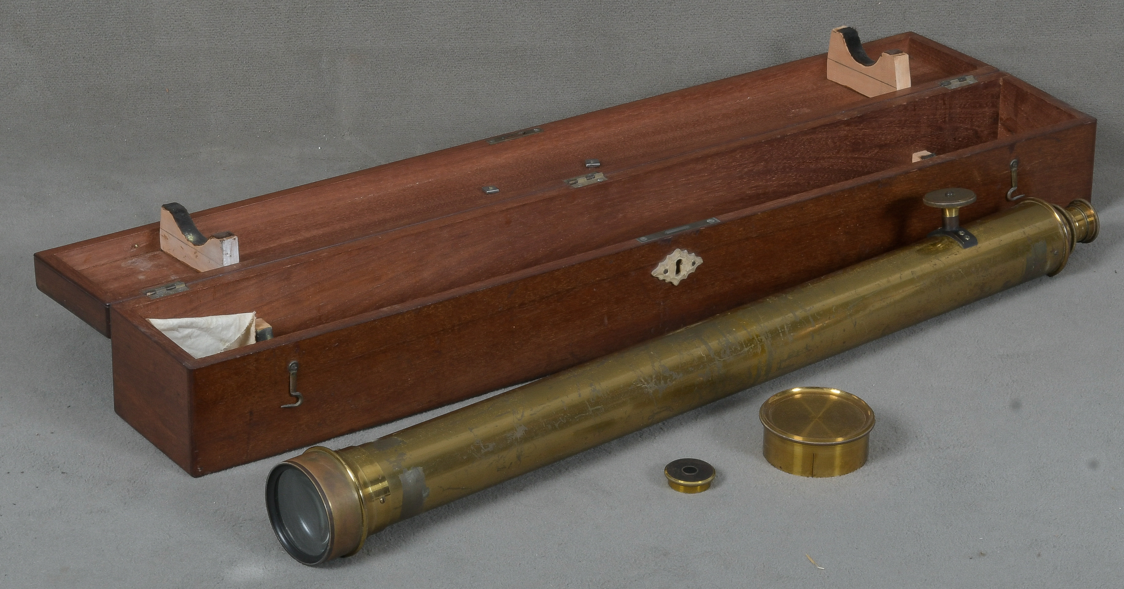 - Katalog-Nr: 95Teleskop im Mahagonikasten. Dresden, Arno Graf 19./20. Jh. Messing, seitl. gemarkt, L=77,5 cm / Kasten: H=12 cm, L=82 cm, B=12 cm.o.L.
