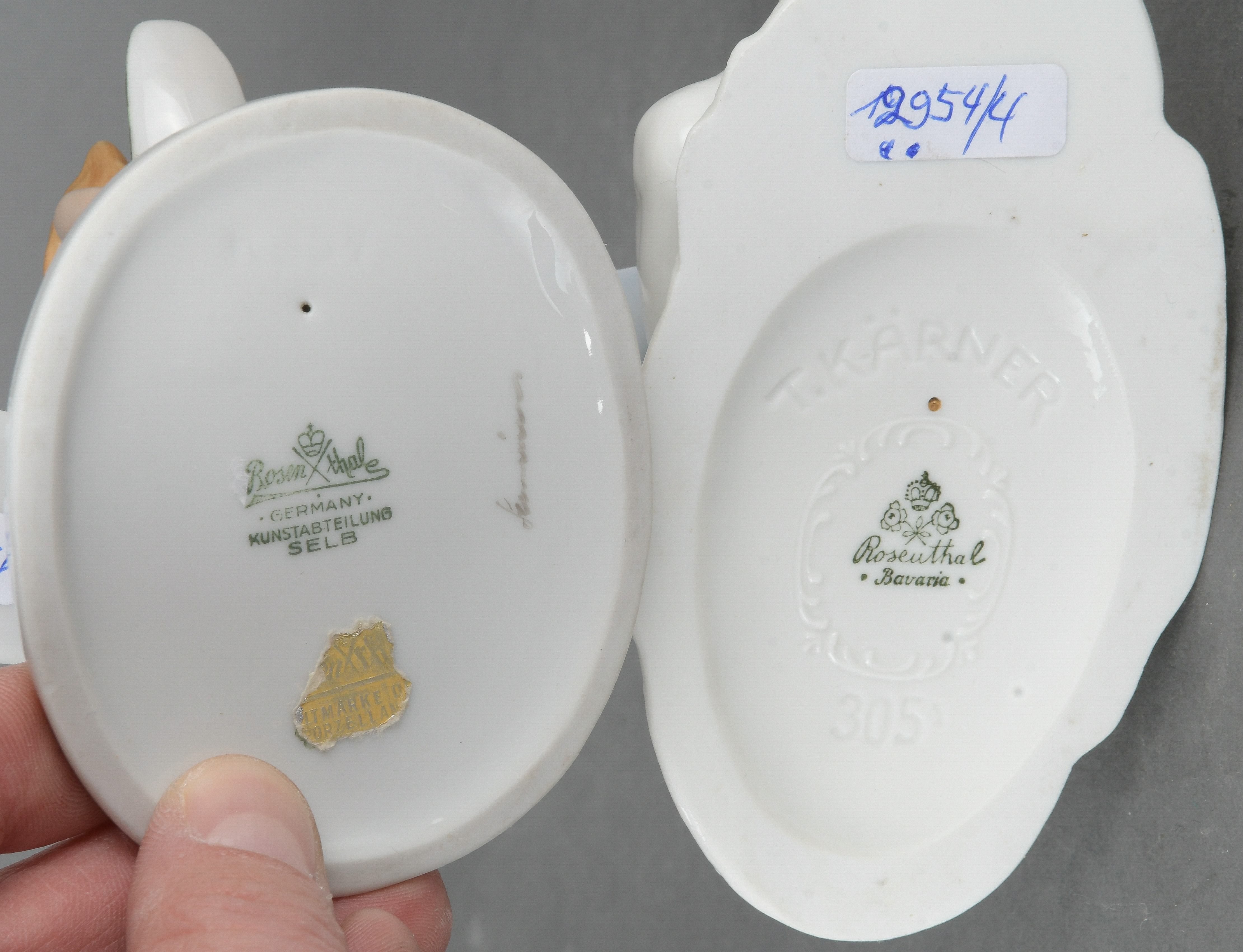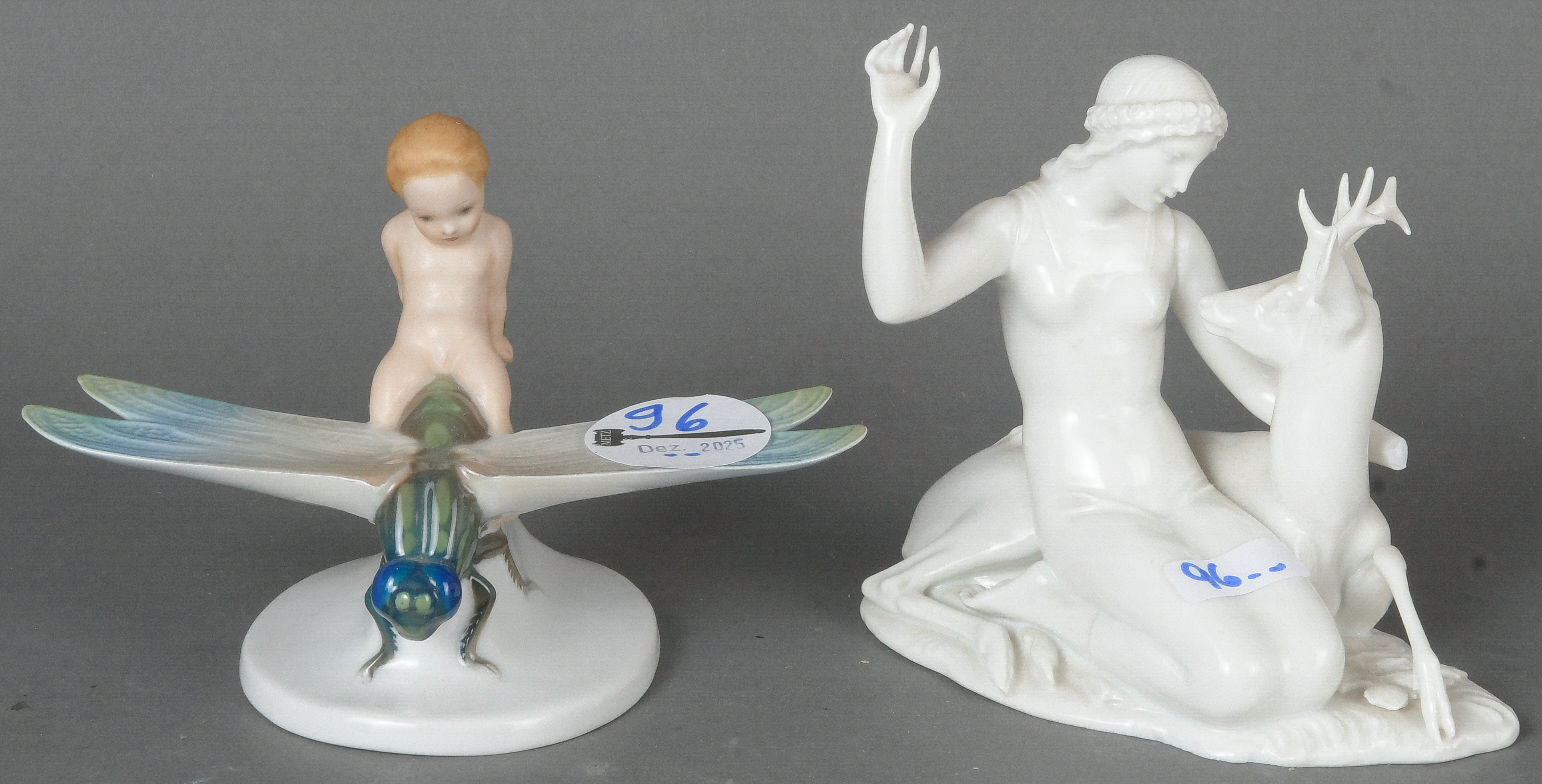 - Katalog-Nr: 96Libellenreiter und Jagdgöttin Diana. Rosenthal 20. Jh. Porzellan, bunt bemalt bzw. weiß glasiert, Entwurf und sign. T.(heodor) Kärner / Karl Himmelstoss, H=9,9 / 11,5 cm.o.L.