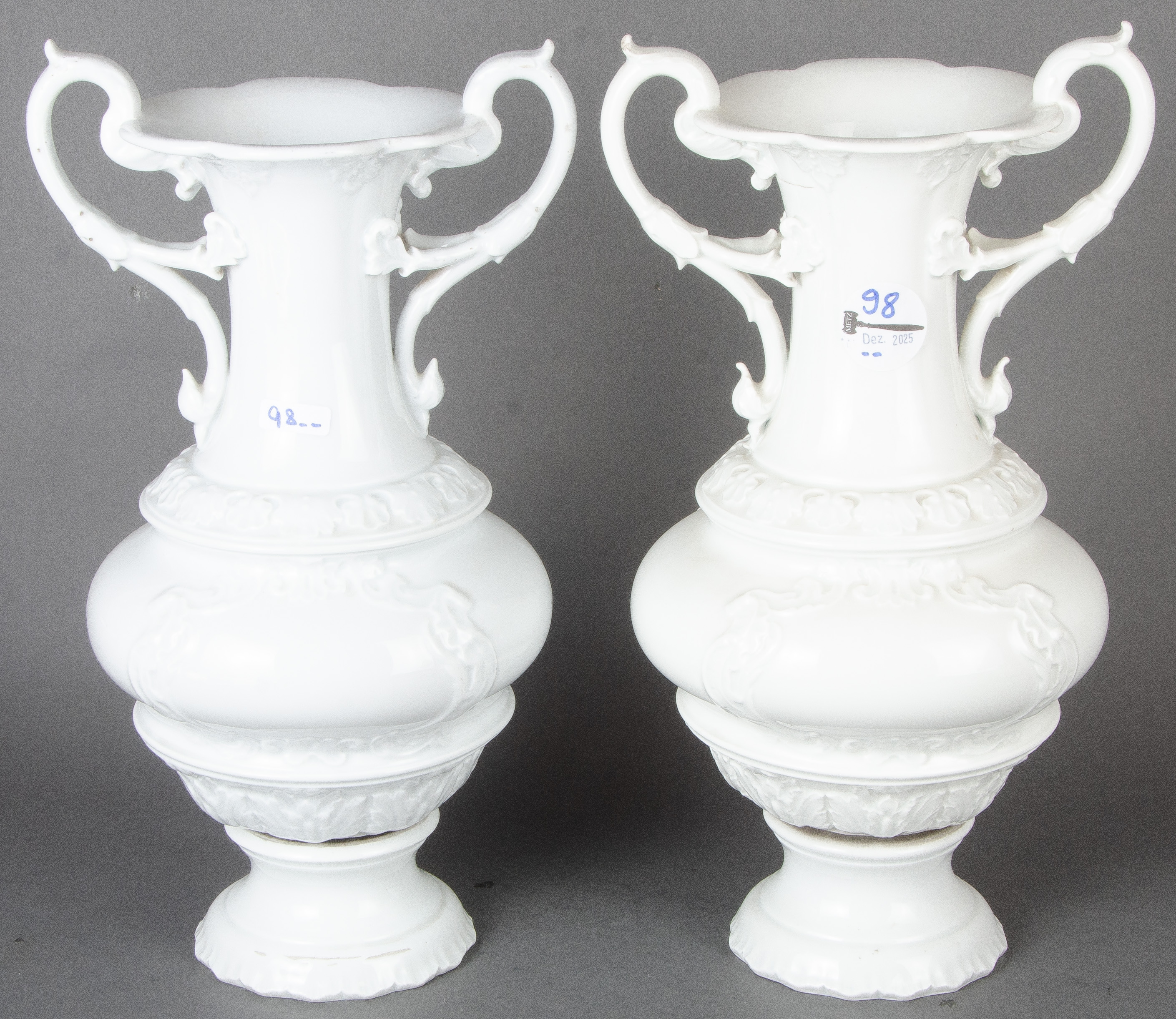 - Katalog-Nr: 98Paar Henkelvasen. Meissen 19. Jh. Porzellan, weiß glasiert; am Boden unterglasurblaue Schwertermarke mit zwei Schleifstrichen, H=je 34,2 cm.o.L.