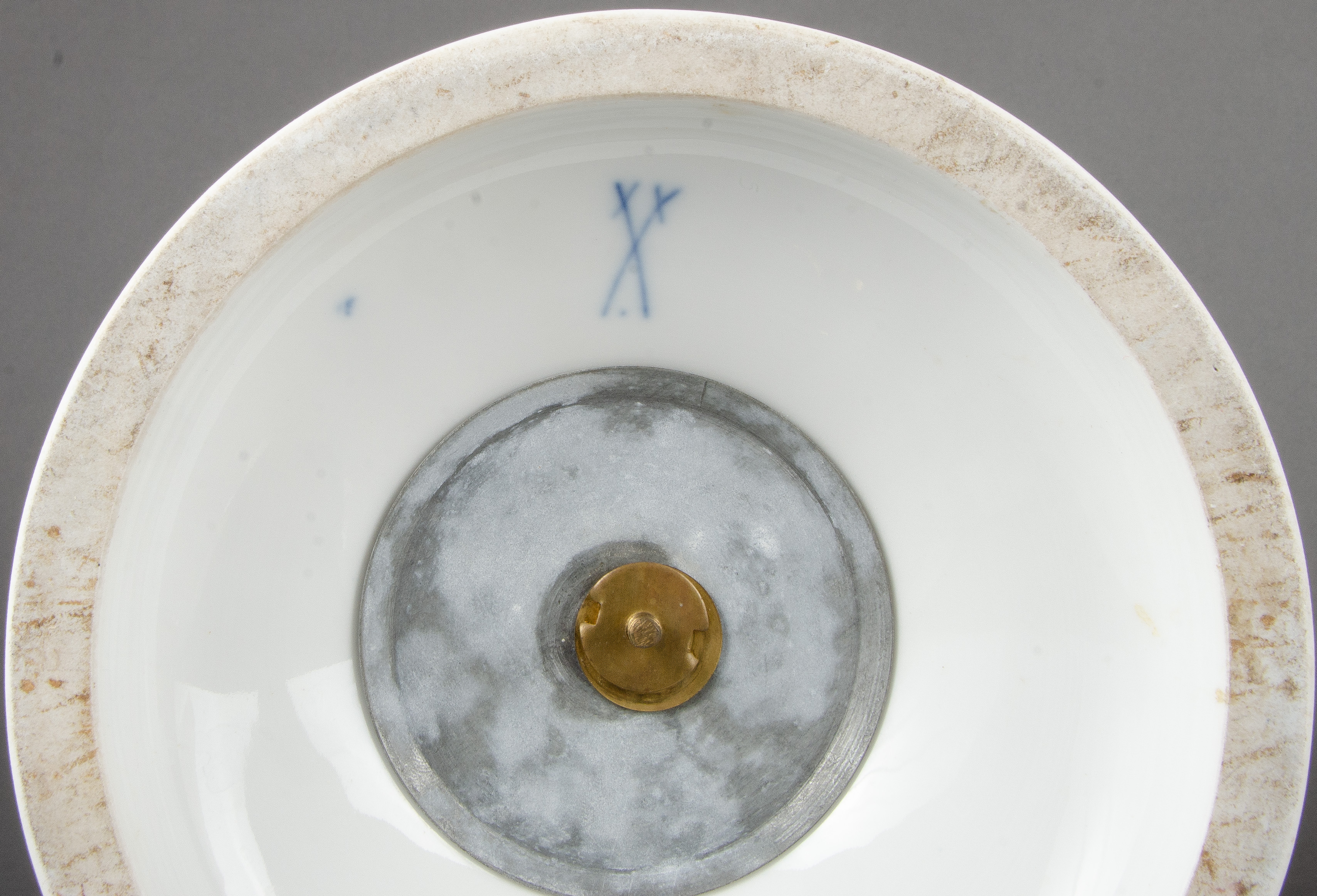 - Katalog-Nr: 82Doppelhenkelvase. Meissen 19. Jh. Porzellan, mit kobaltblauem Fond, Goldrändern und Golddekor, Schauseite bunt bemalt mit Blumenbouquet; am Boden unterglasurblaue Schwertermarke, Modell von Ernst August Leuteritz, H=41 cm.o.L.