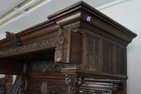 - Katalog-Nr: 76Kirchengestühl. Wohl Norddeutschland 19. Jh. Massiv Eiche, geschnitzt mit figürlichen Szenen, Faltwerk, Maskaronen, teilw. gedrechselt; Kugelfüße, profilierter Sockel, Truhenbank flankiert von Säulen, darüber rechts und links Schübe, verkröpftes Gesims, reich verzierte Rückwand und Himmel, H=202 cm, B=195 cm, T=70 cm. (mit Ergänzungen)o.L.
