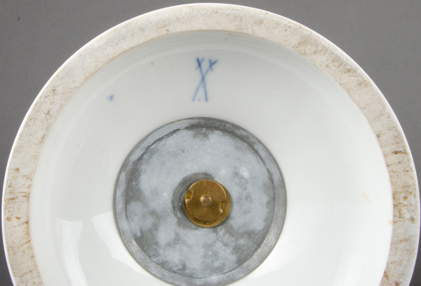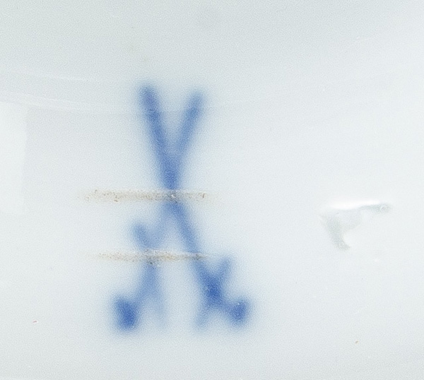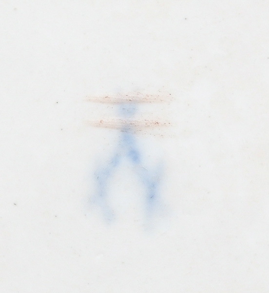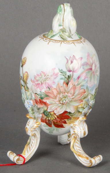 - Katalog-Nr: 99Zierei auf hohen geschweiften Beinen. Berlin um 1900. Porzellan, exzellent bunt floral bemalt in Weichmalerei; am Boden unterglasurblaue Szeptermarke mit einem Schleifstrich, H=13,3 cm.o.L.