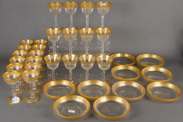 - Katalog-Nr: 8734-tlge. Trinkglasgarnitur „Thistle Gold“. Frankreich, Saint Louis 20. Jh. Farbloses Glas, geätzt und geschliffen, mit Goldrand. Bestehend aus: Je zwölf Likörschalen (H=12 cm), zwölf Sherrykelche (H=12,5 cm) und 10 runde Schälchen (H=3,4 cm, D=14,4 cm).o.L.