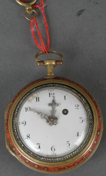 - Katalog-Nr: 88Taschenuhr in Schutzgehäuse. Genf, wohl Meister Philipp Terrot. Uhrengehäuse mit Gelbgold-Deckel, blau emailliert und besetzt mit Diamantrosen, Emailzifferblatt mit Schlüsselaufzug, Spindelwerk; vergoldetes Schutzgehäuse, beidseitig emailliert, D=4,4 / 4,9 cm. (Schutzgehäuse teilw. mit Abplatzungen / Funktion ungeprüft)o.L.