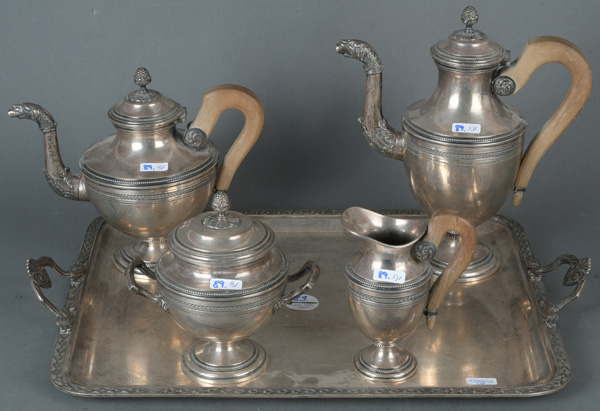 - Katalog-Nr: 89Fünftlgs. Kaffee- und Teeservice. Deutsch 20. Jh. 800er Silber, ca. 3.800 g, am Boden gepunzt. Bestehend aus: Eine Kaffeekanne (H=23,5 cm), eine Teekanne (H=18,5 cm), ein Milchgießer (H=15 cm), eine Zuckerdose (H=16 cm) und ein vierpassiges Tablett (H=5,5 cm, B=51 cm, T=34 cm).o.L.
