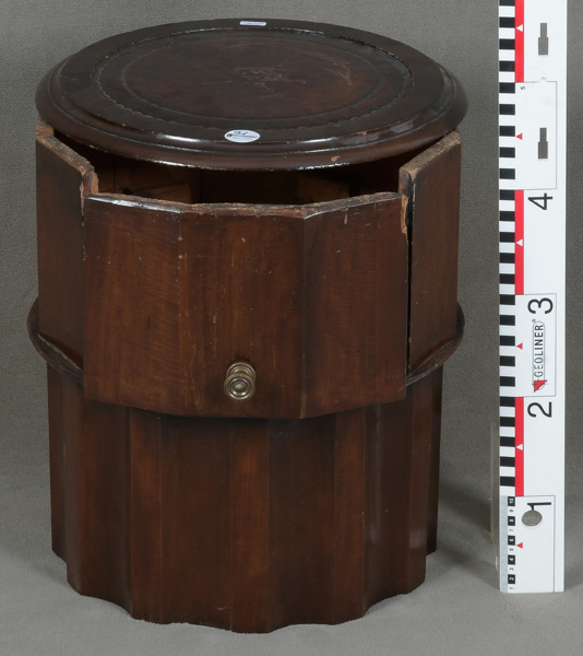 - Katalog-Nr: 91Toilettenhocker. England 19. Jh. Massiv Mahagoni; zweiteilig mit gewellter Wandung, profilierter Deckel mit mittig eingelegtem, geprägtem braunem Leder, H=47 cm, D=41 cm.o.L.