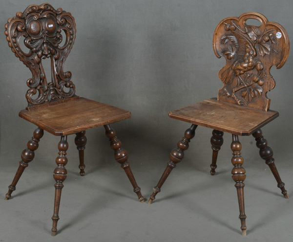 - Katalog-Nr: 94Zwei Historismus-Bauernstühle. Deutsch um 1900. Massiv Eiche bzw. Nussbaum, teilw. geschnitzt mit Blumen, Blättern, Greifvögeln und Rocaillen; gedrechselte Beine, eckige Sitzfläche, durchbrochene, geschweifte Rückenlehne.o.L.
