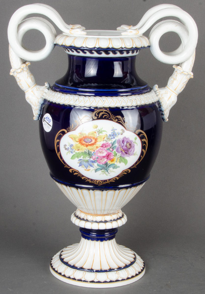 - Katalog-Nr: 100Große Schlangenhenkelvase. Meissen Pfeifferzeit 1924–34. Porzellan, mit kobaltblauem Fond, gelb staffierten Rändern und Golddekor, Schauseite bunt bemalt mit Blumenbouquet; am Boden unterglasurblaue Schwertermarke, Modell von Ernst August Leuteritz, H=48,5 cm. (min. best.)o.L.