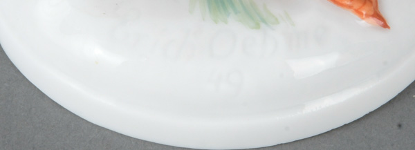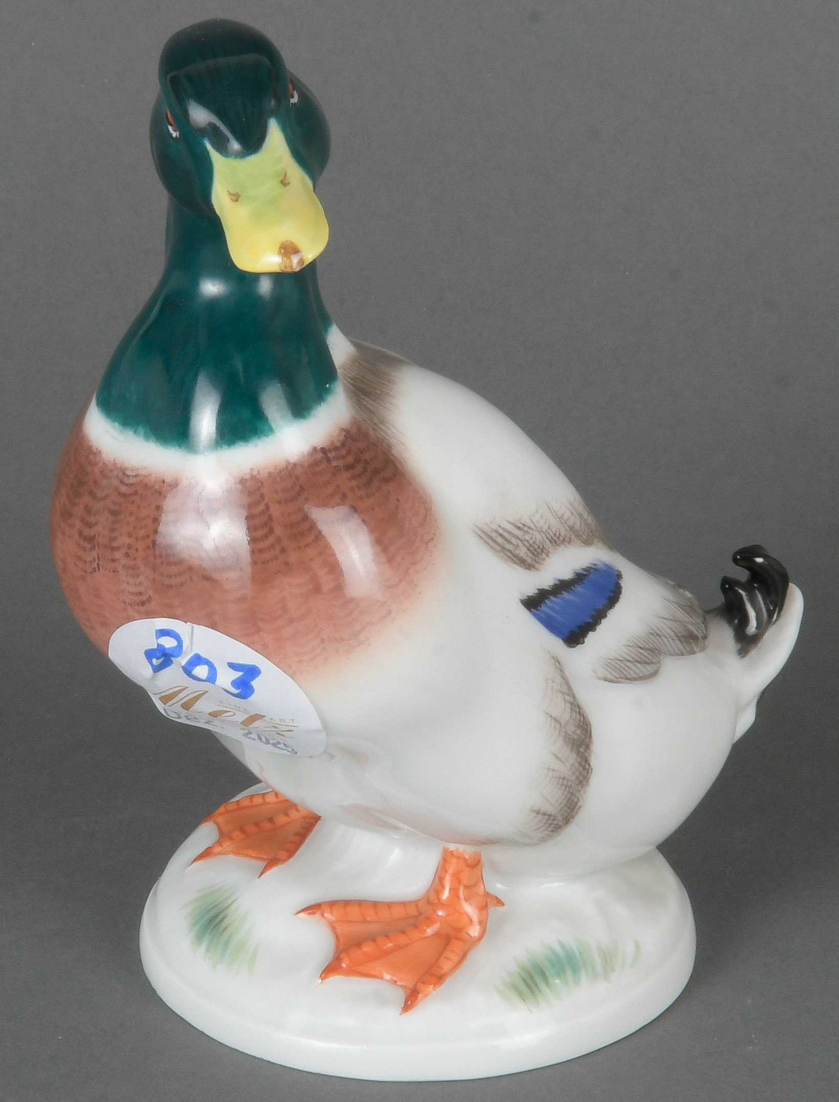 - Katalog-Nr: 803Wildente. Meissen 20. Jh. Porzellan, naturalistisch modelliert und staffiert; am Boden unterglasurblaue Schwertermarke, Entwurf und sign. E(rich) Oehme, H=13,9 cm.o.L.
