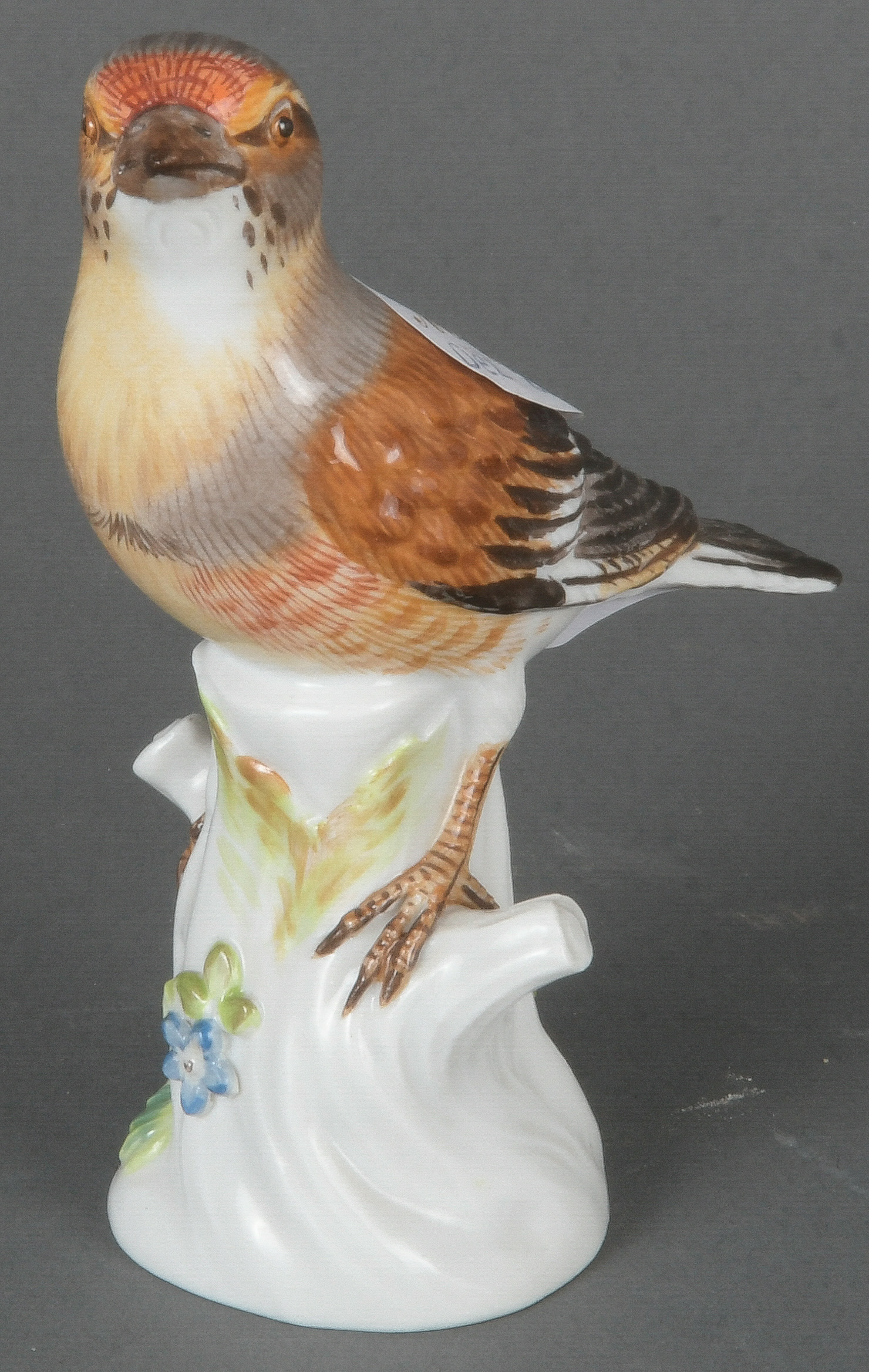 - Katalog-Nr: 801Drossel. Meissen 20. Jh. Porzellan, naturalistisch modelliert und staffiert; am Boden unterglasurblaue Schwertermarke, Modell nach Johann Joachim Kaendler, H=11,5 cm.o.L.