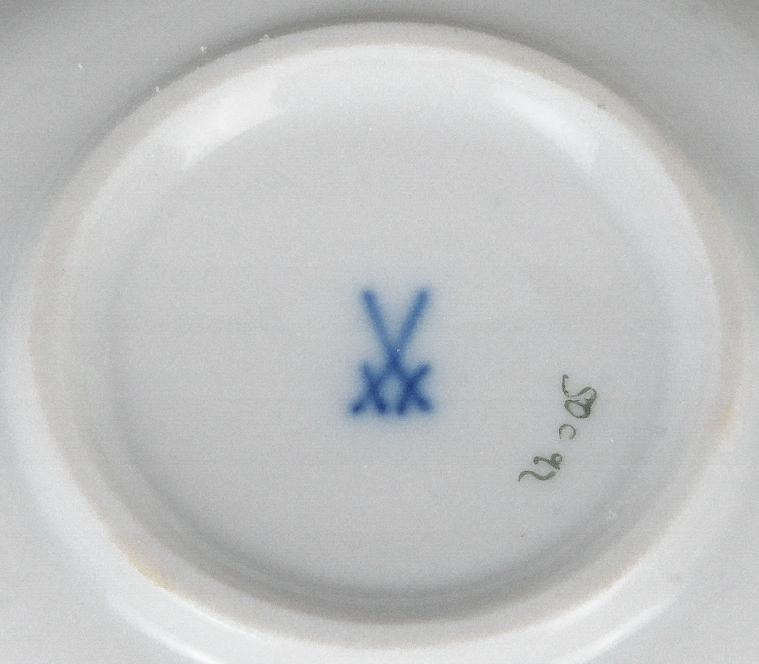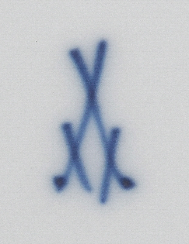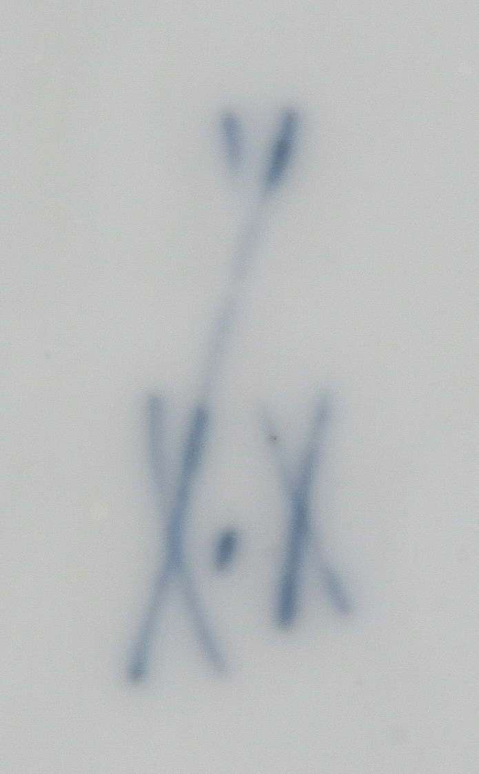 - Katalog-Nr: 811Ovaler Durchbruchskorb. Meissen 19. Jh. Porzellan, mit Korbflechtrelief, Goldrand und bunt gemaltem Blumen- und Obstbouquet; verso unterglasurblaue Schwertermarke, H=5,1 cm, B=15 cm, T=11,5 cm.o.L.