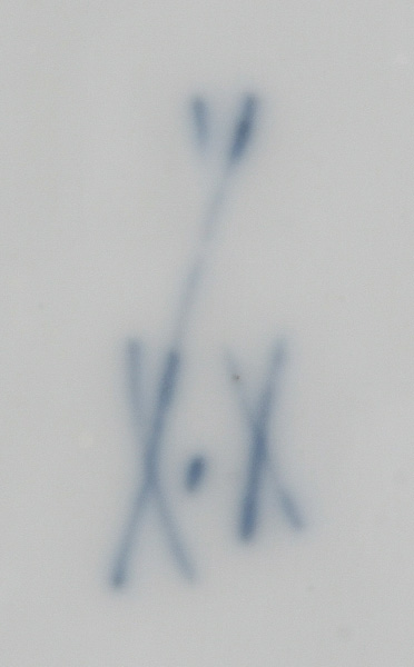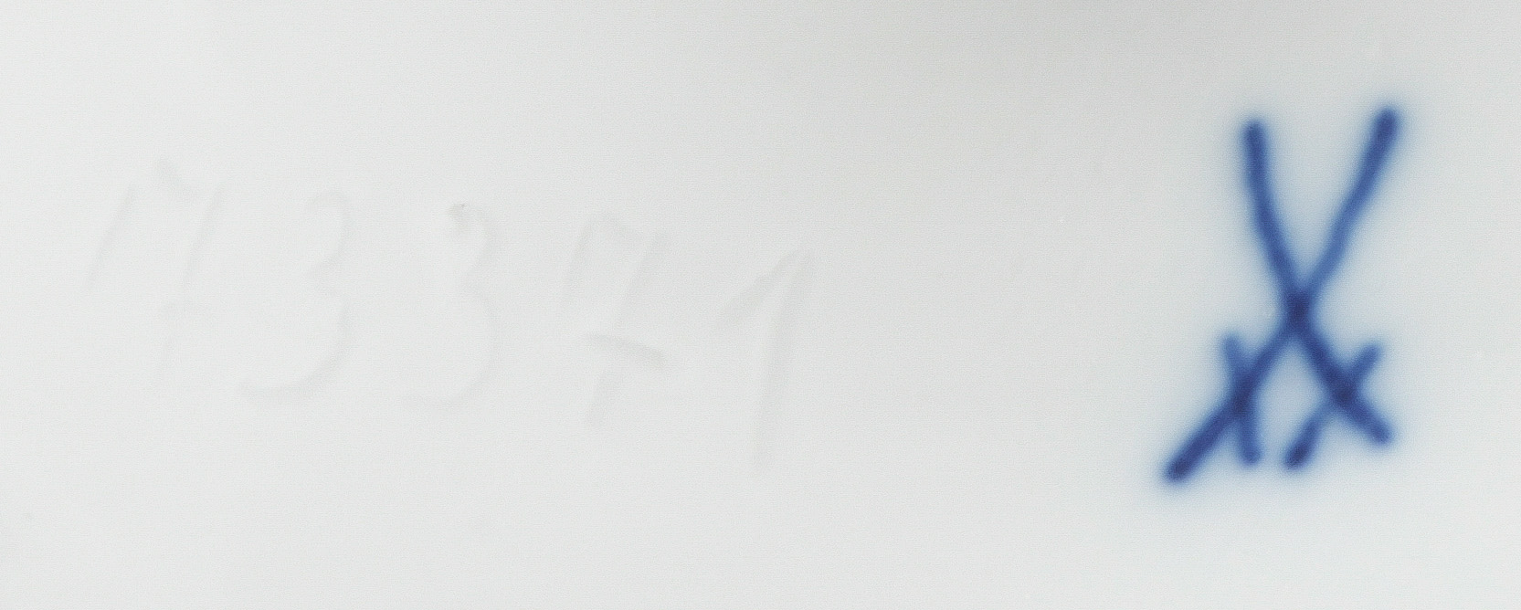 - Katalog-Nr: 810Große, ovale Platte. Meissen 1763-73. Porzellan, mit rocaillereliefiertem, gold gesäumtem Lippenrand und brauncamaieu gemaltem Floraldekor; verso unterglasurblaue Schwertermarke, H=3,5 cm, B=44 cm, T=31,5 cm.o.L.