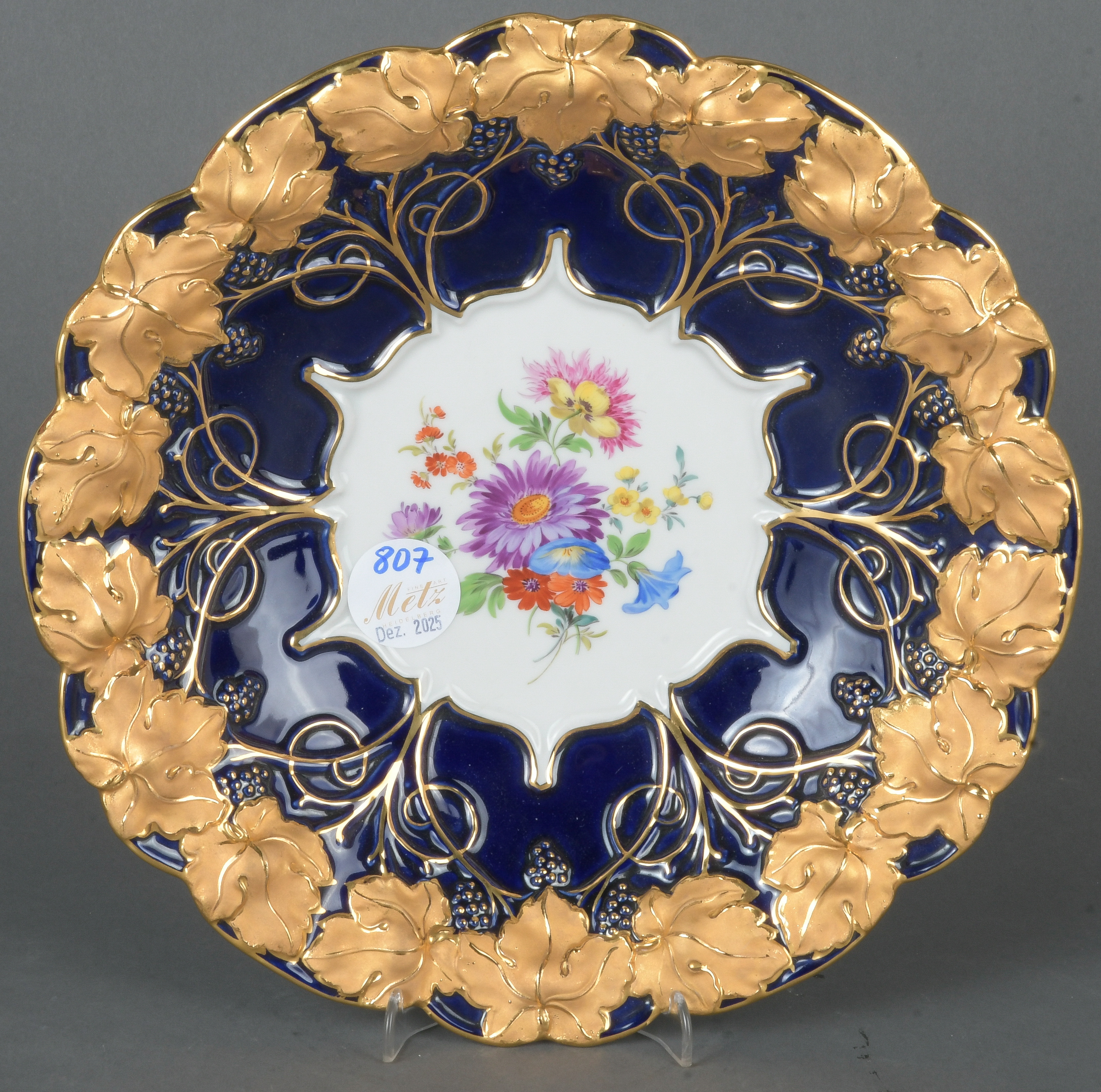 - Katalog-Nr: 807Runde Prunkschale. Meissen 20. Jh. Porzellan, mit aufwendigem, gold gehöhtem Blätterrelief, kobaltblauem Fond und bunt gemaltem Blumenbouquet; verso unterglasurblaue Schwertermarke, D=27 cm.o.L.
