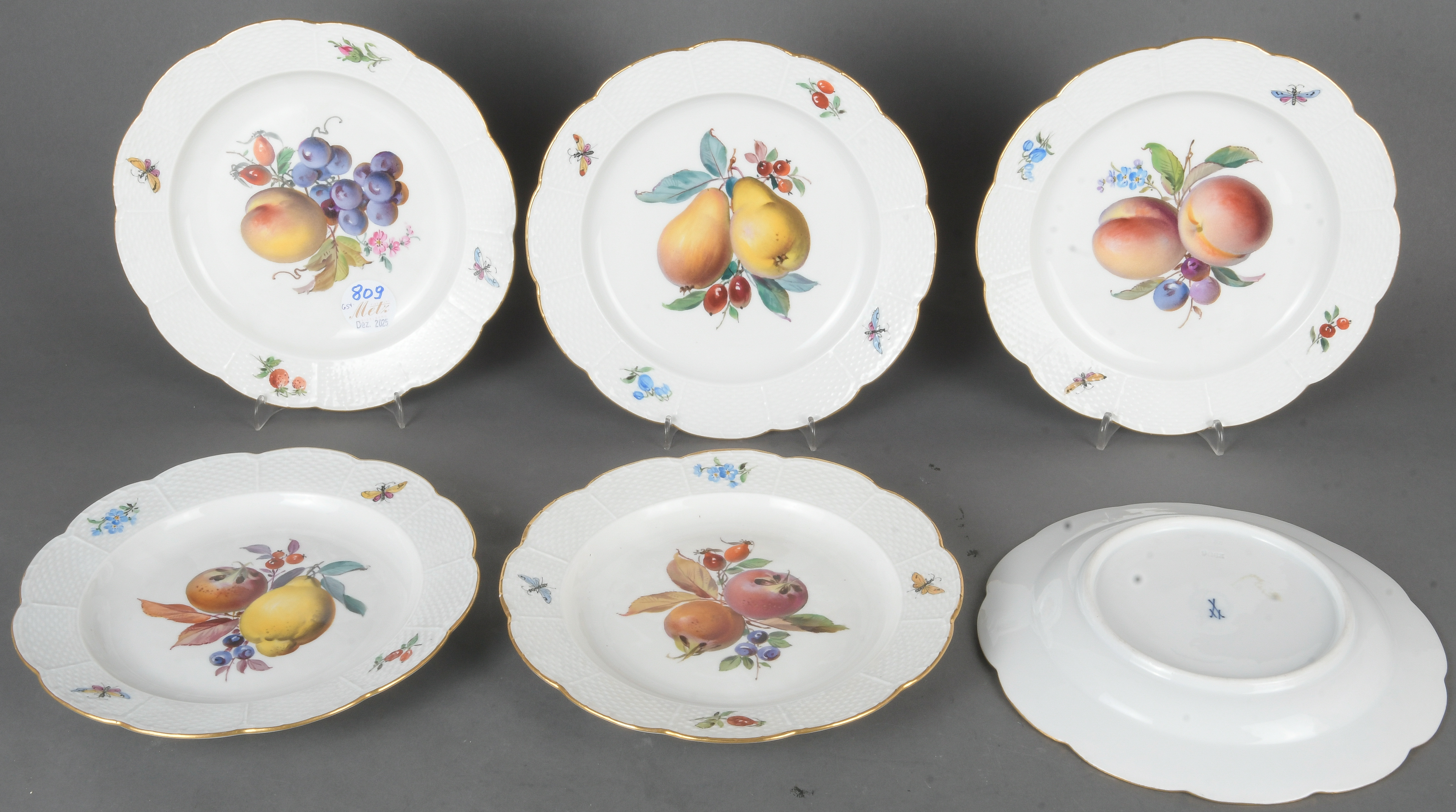 - Katalog-Nr: 809Sechs Teller. Meissen 19. Jh. Porzellan, mit Korbflechtrelief, Goldrand und bunt gemaltem Obstbouquet; verso unterglasurblaue Schwertermarke, D=je 21,5 cm.o.L.