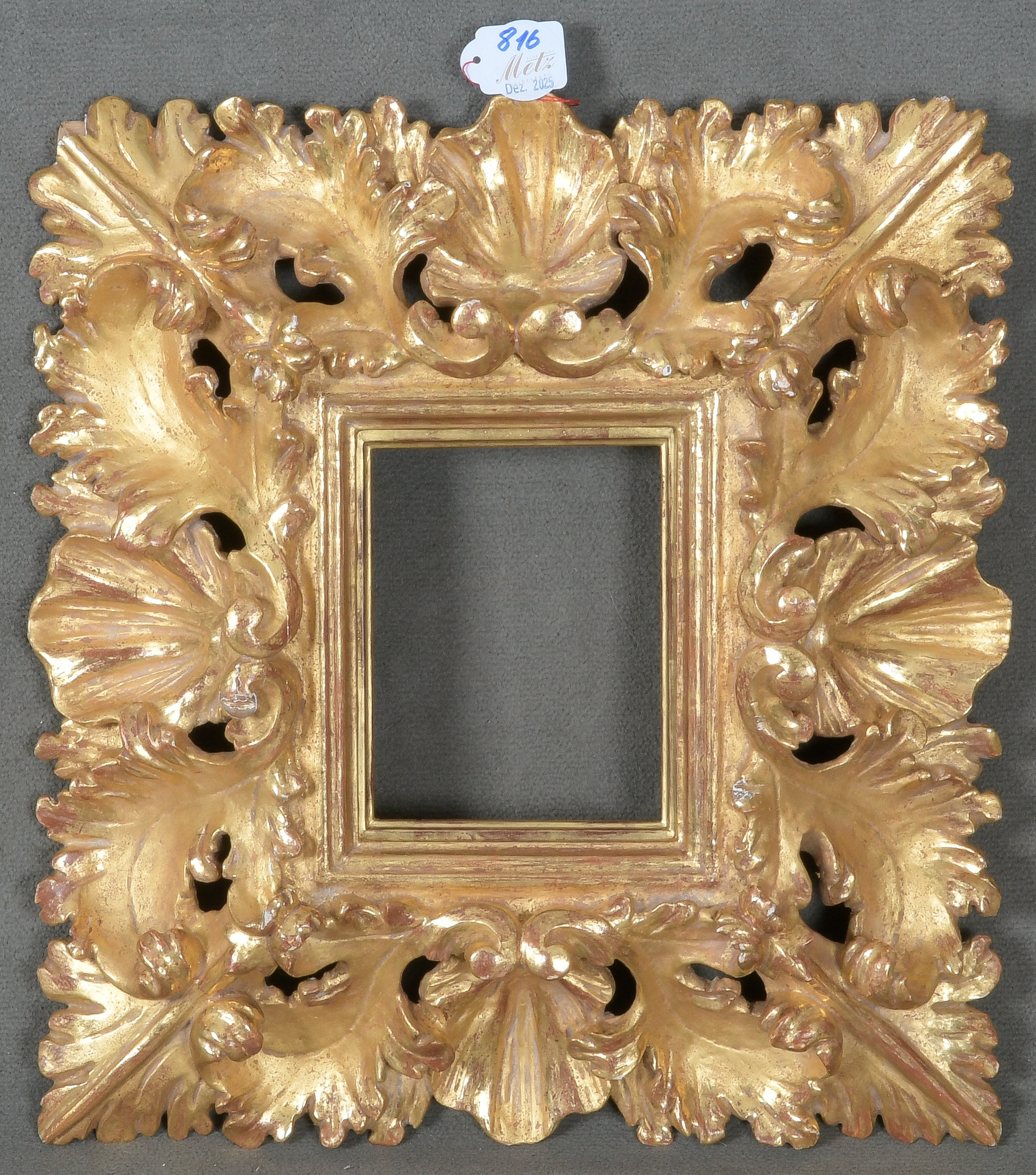 - Katalog-Nr: 816Bilderrahmen. Italien 20. Jh. Massivholz, geschnitzt, auf Kreidegrund blattvergoldet, monogr. „M.P.“, 16,5 x 13 cm (lichtes Maß).o.L.