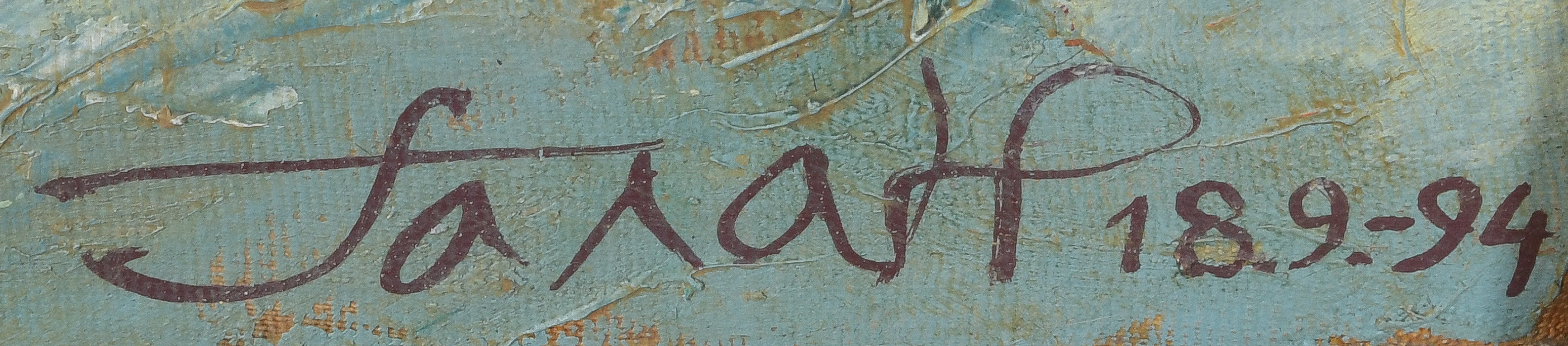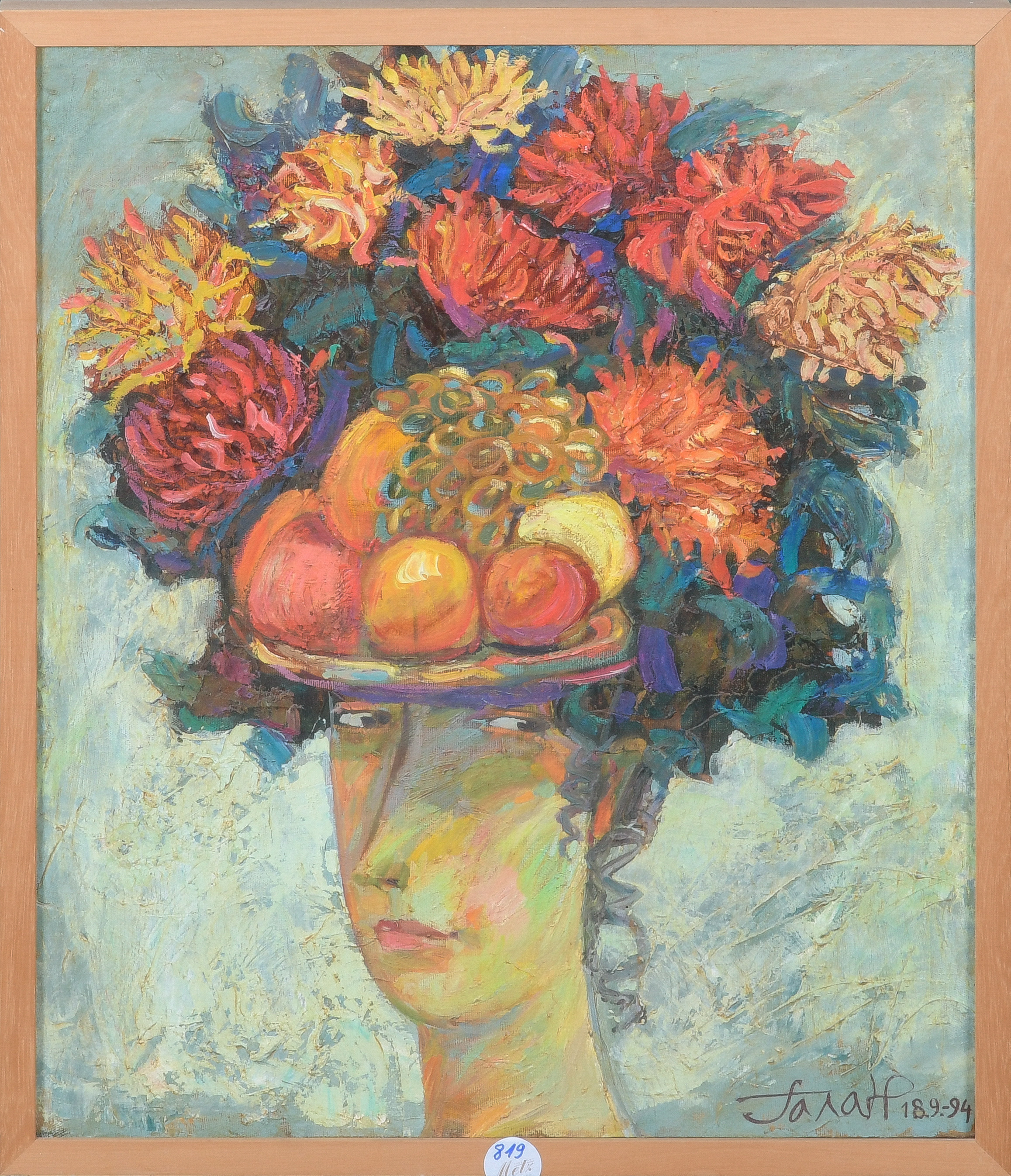 - Katalog-Nr: 819Maler des 20. Jhs. Frauenkopf mit üppig blumen- und obstgeschmücktem Hut. Öl/Lw., re./u. unleserlich sign./dat. 1994, gerahmt, 59,5 x 49 cm.o.L.