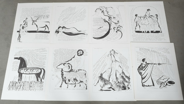 - Katalog-Nr: 823Angela Paysan (1936-1992). Zwölf Holzschnitte mit stilisierten Illustrationen zu den Götterliedern der Älteren Edda, je 38 x 30 cm.o.L.