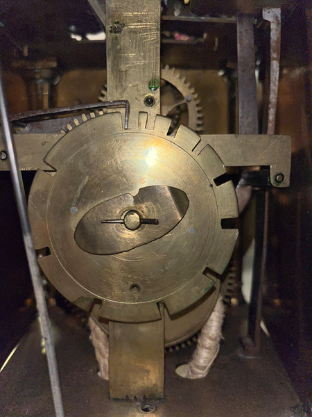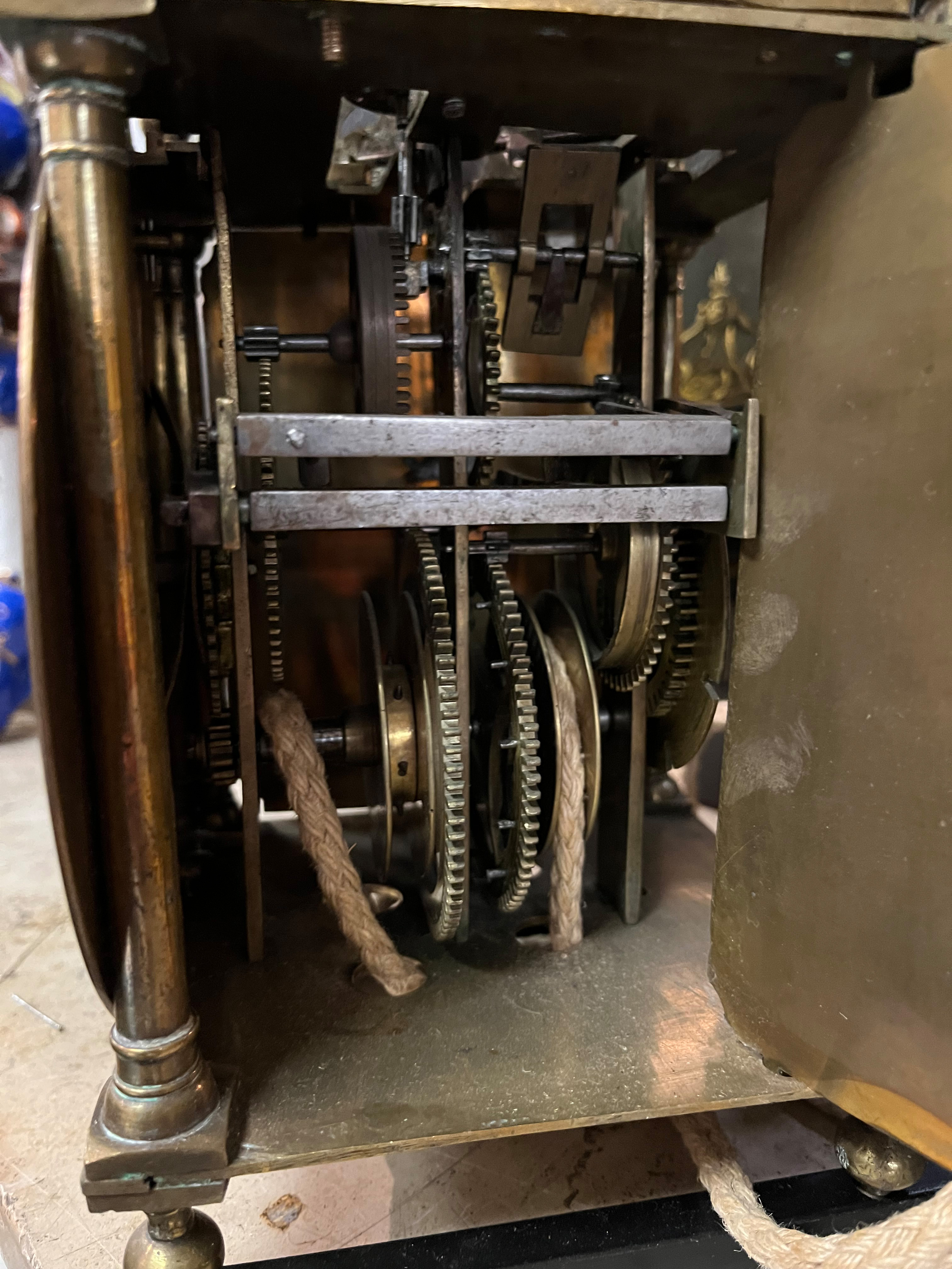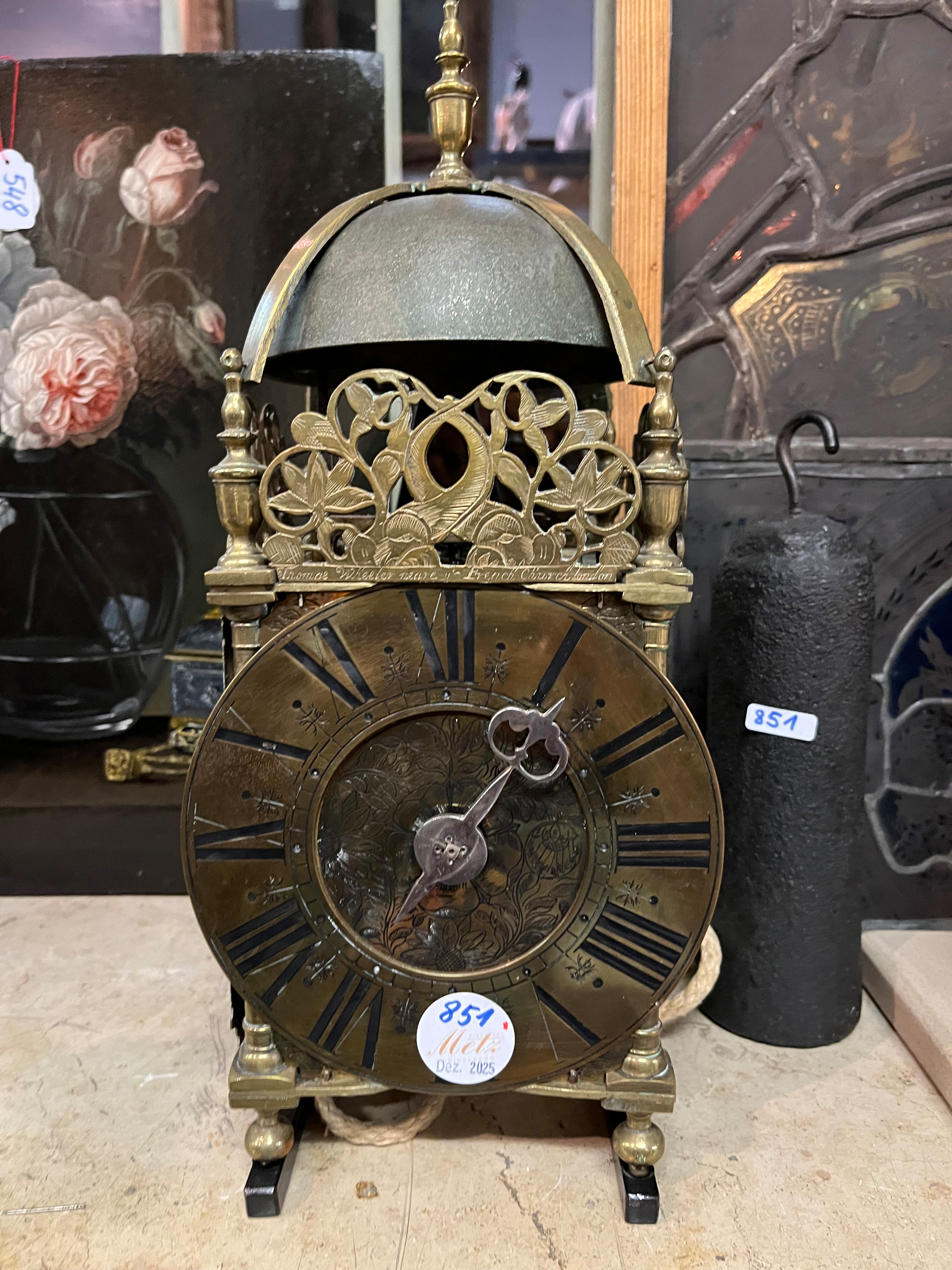 - Katalog-Nr: 851Laternenuhr. London, Thomas Wheeler 17. Jh. Bronze, mit gusseiserner Glocke und Messingzifferblatt, oberhalb beschriftet: „Thomas Wheeler near e ye French Church London“, H=38,5 cm, B=14 cm, T=14,5 cm. (Funktion ungeprüft)o.L.